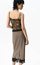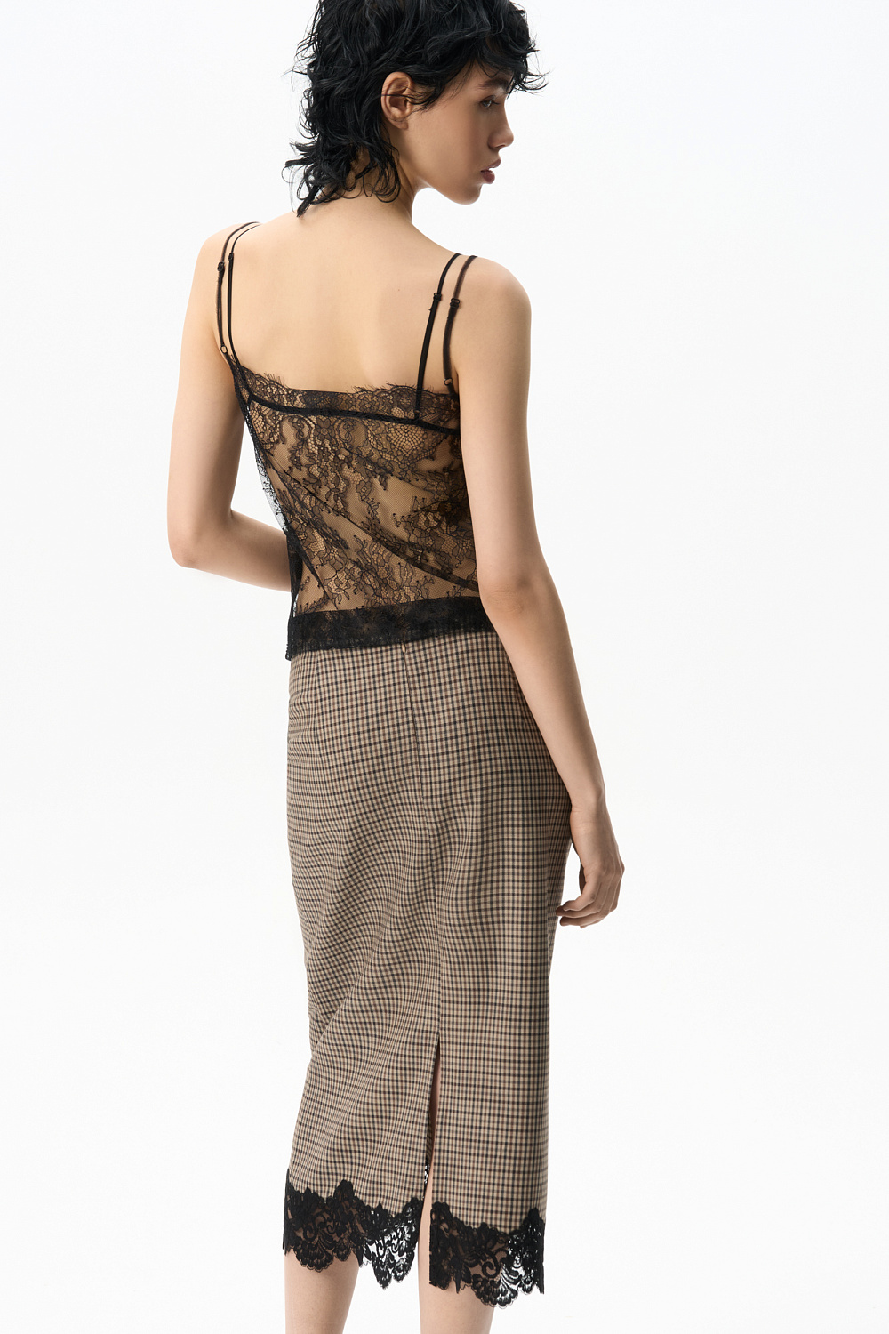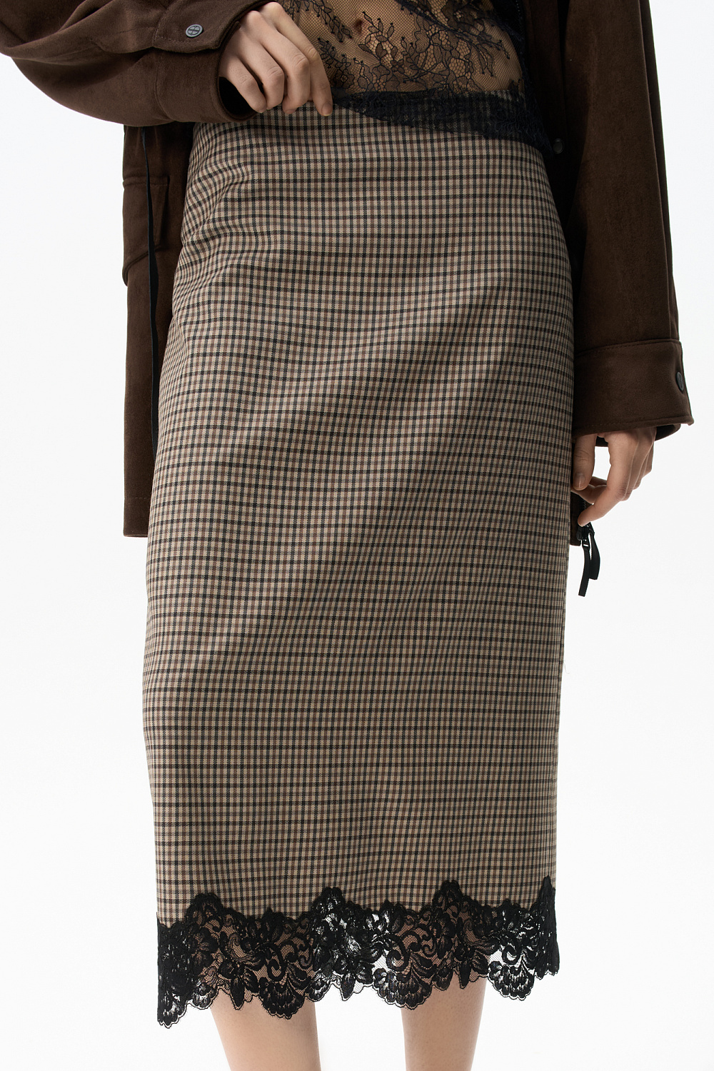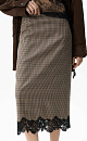 Midi length skirt in Vichy check. Straight cut model with hidden zipper closure. The hem of the product is decorated with lace.