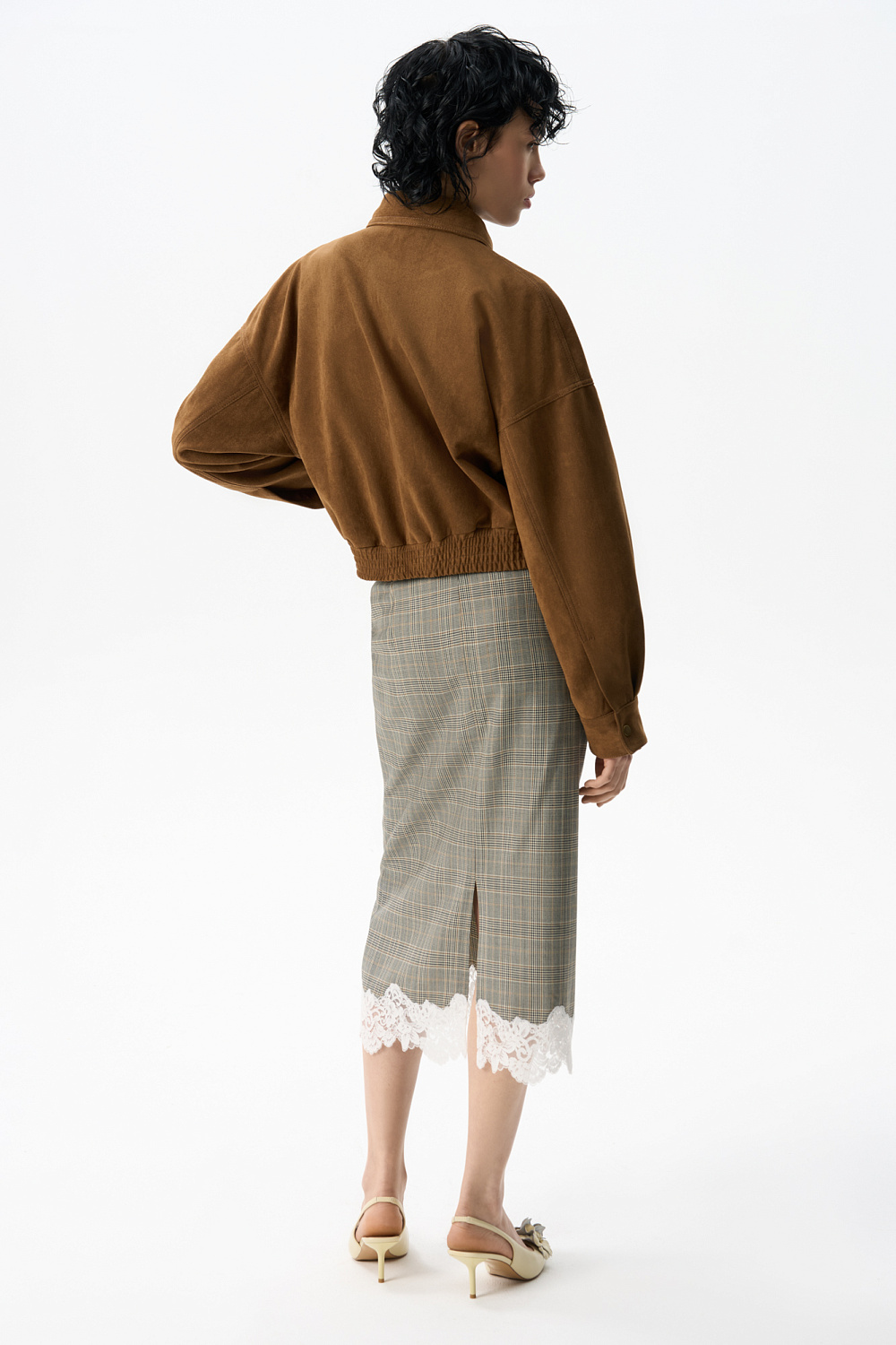 Midi length skirt in Glencheck check. Straight cut model with hidden zipper closure. The hem of the product is decorated with lace.