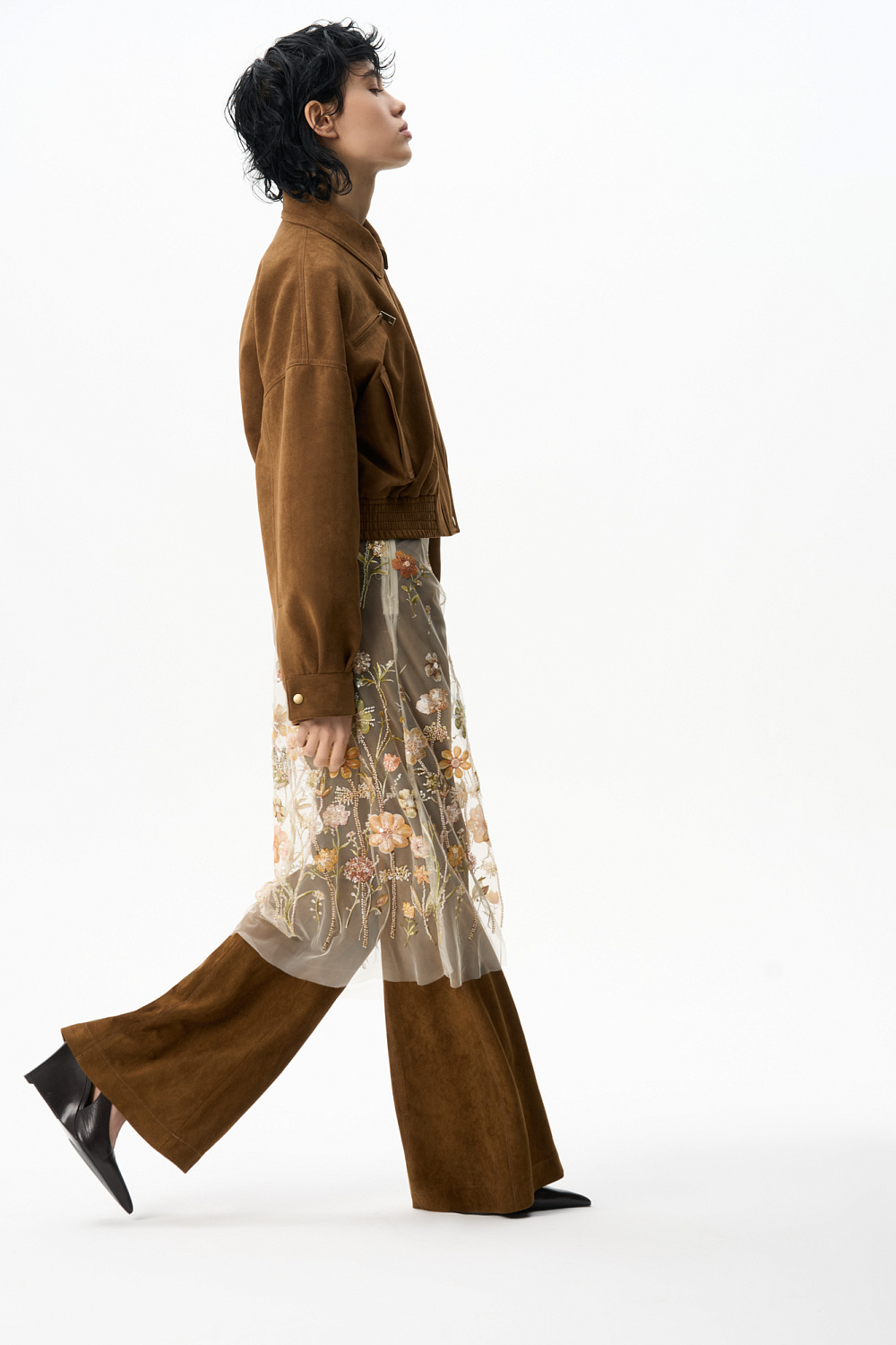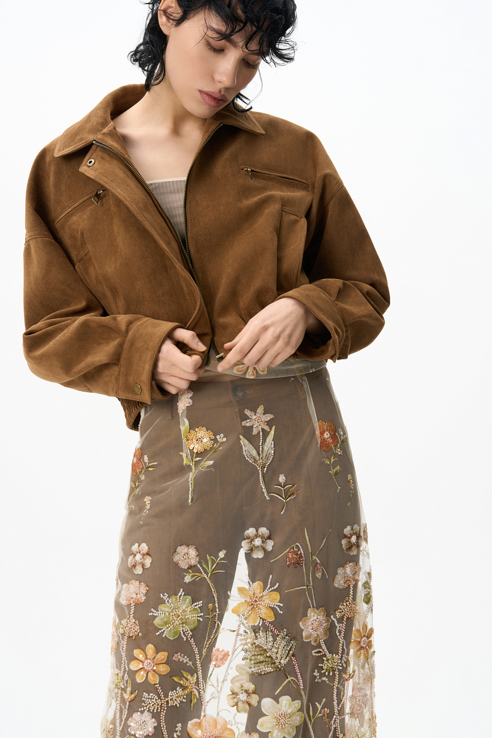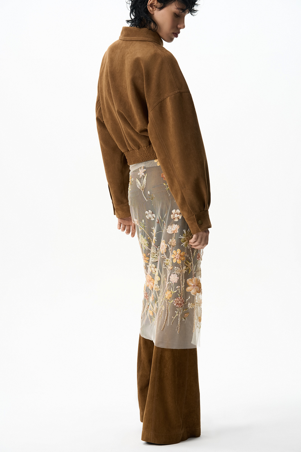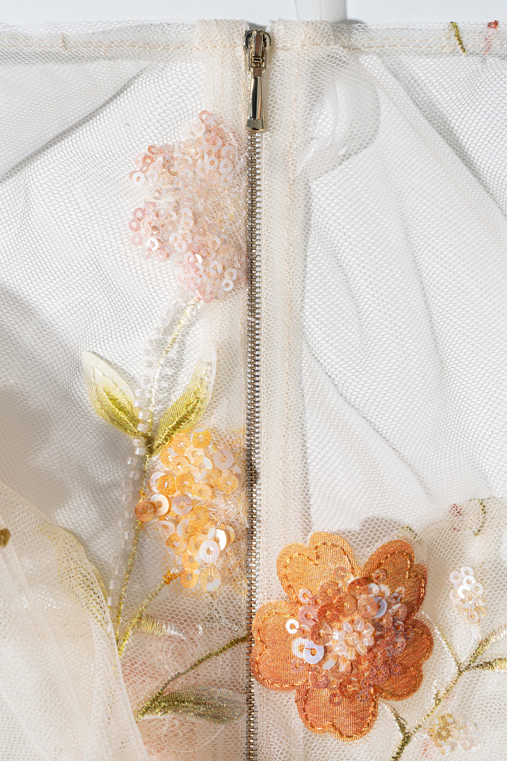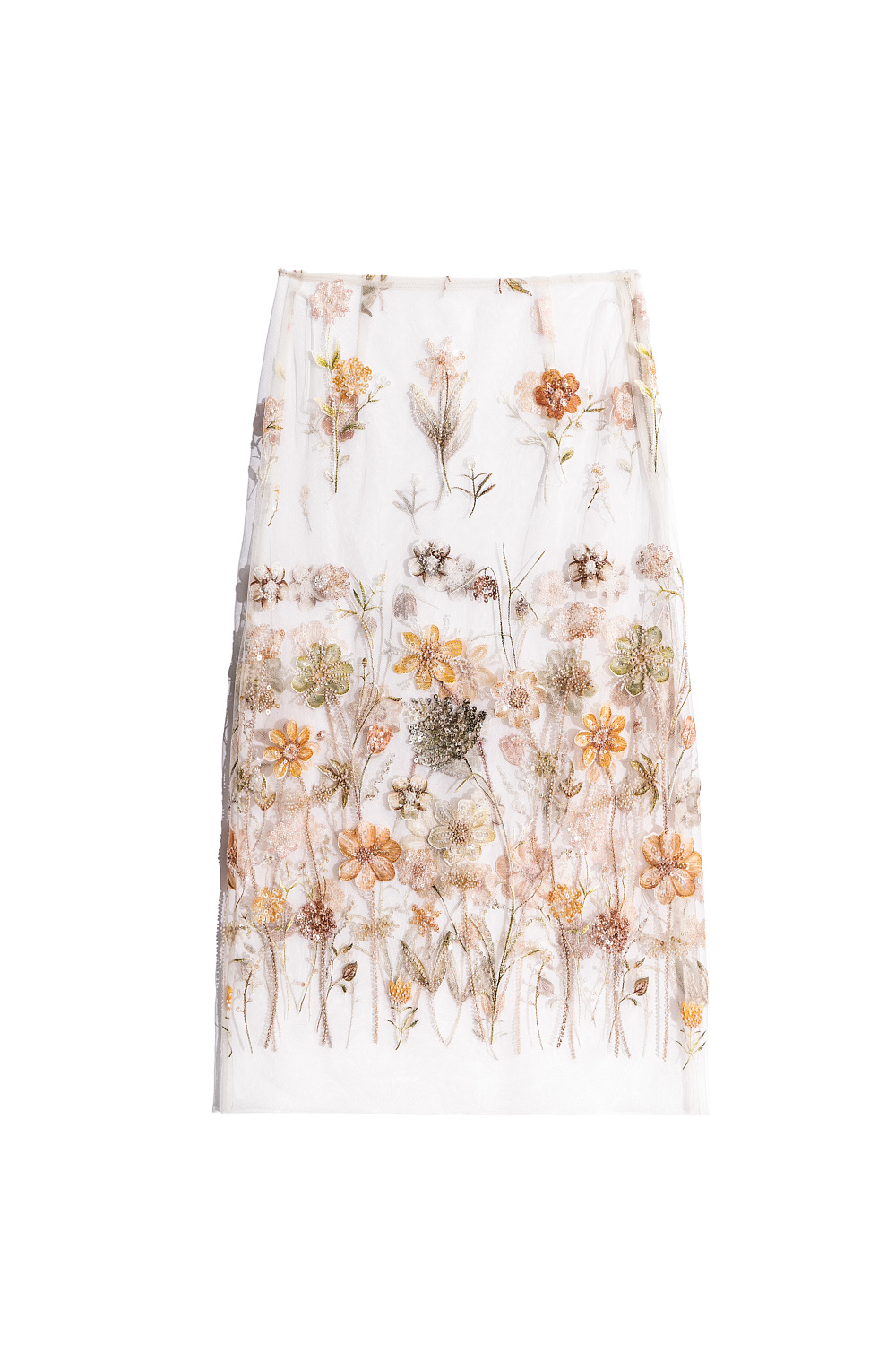 Midi-length skirt with floral patterns embroidered with sequins and beads. Model without lining. Side zip fastening.