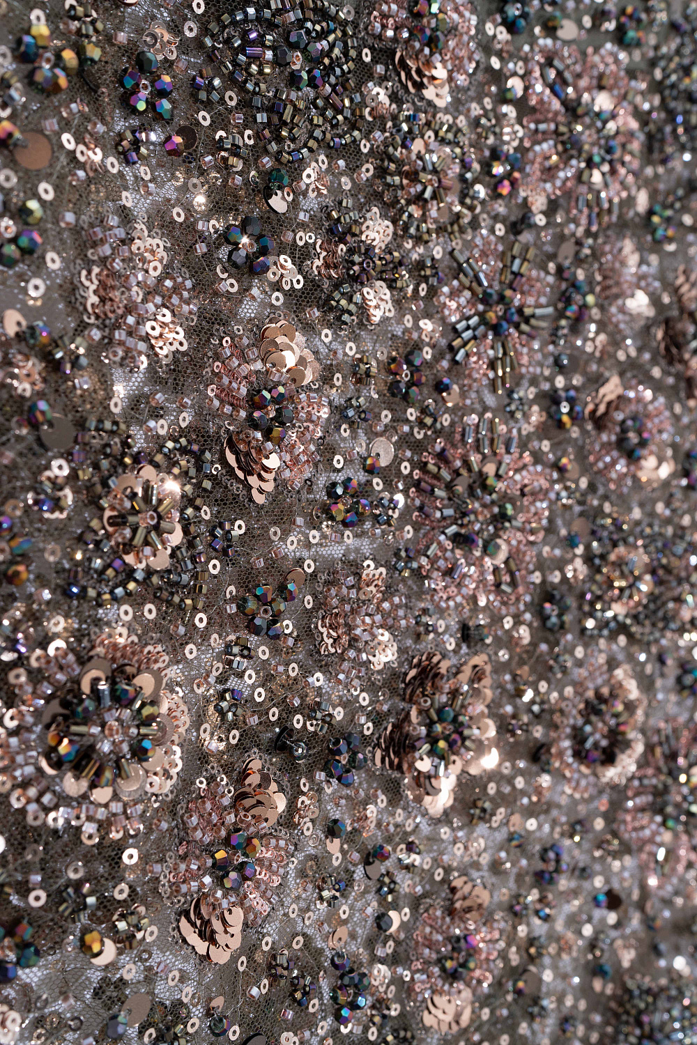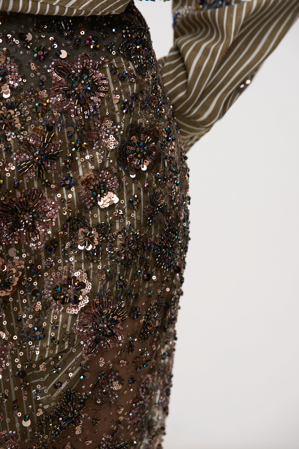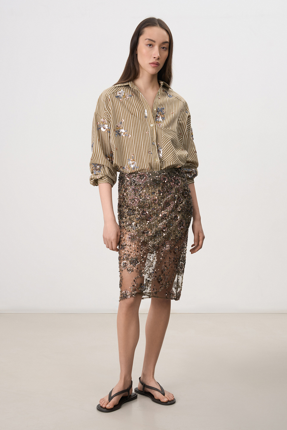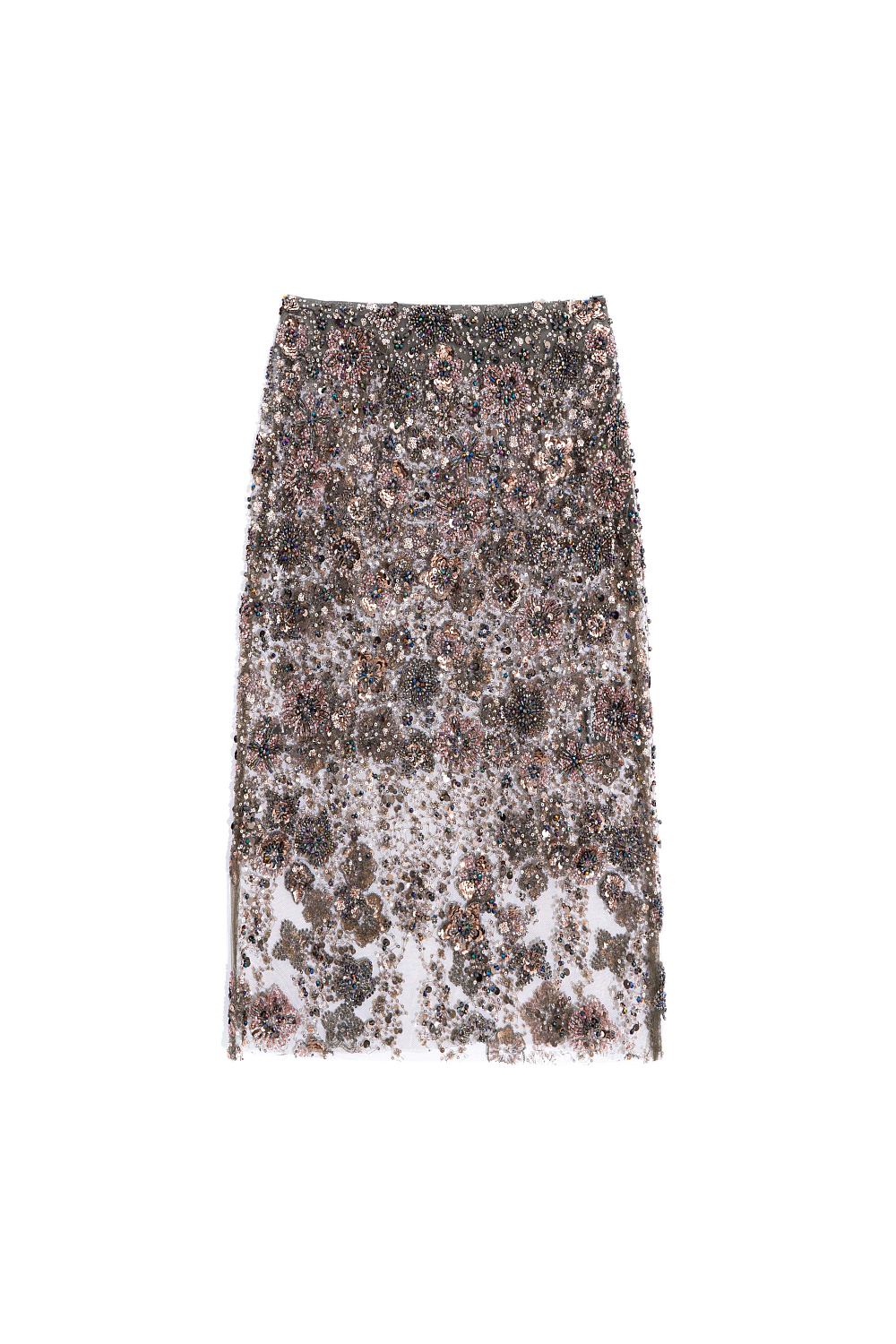 Midi-length skirt with floral patterns embroidered with sequins and beads. The product is unlined.