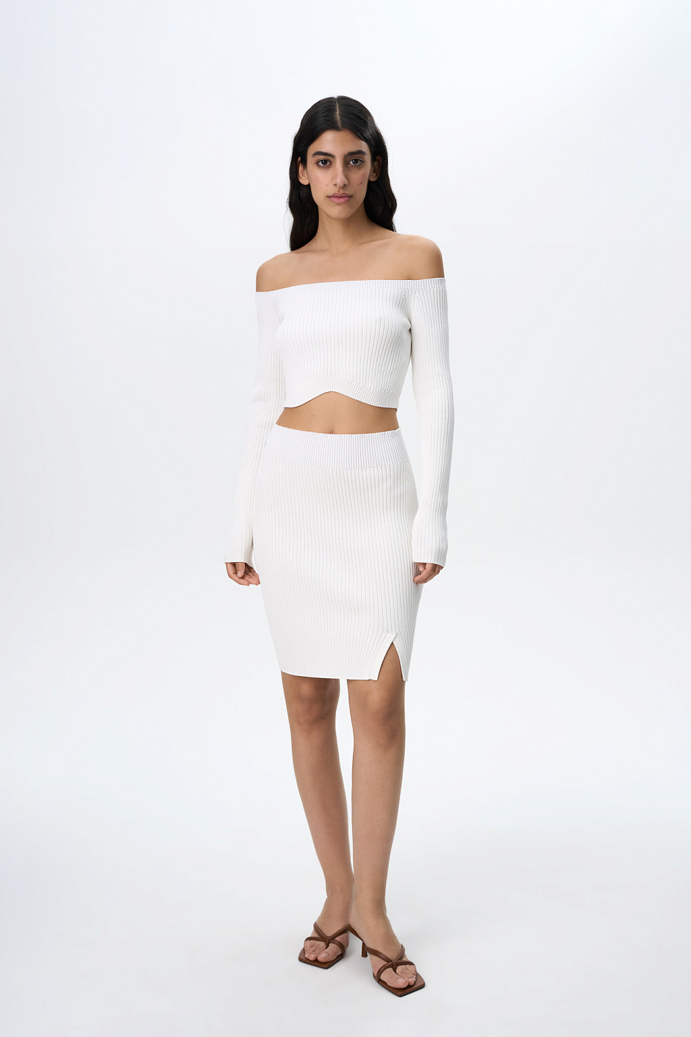 Knitted viscose mini skirt. Fitted silhouette with a small slit on the side.