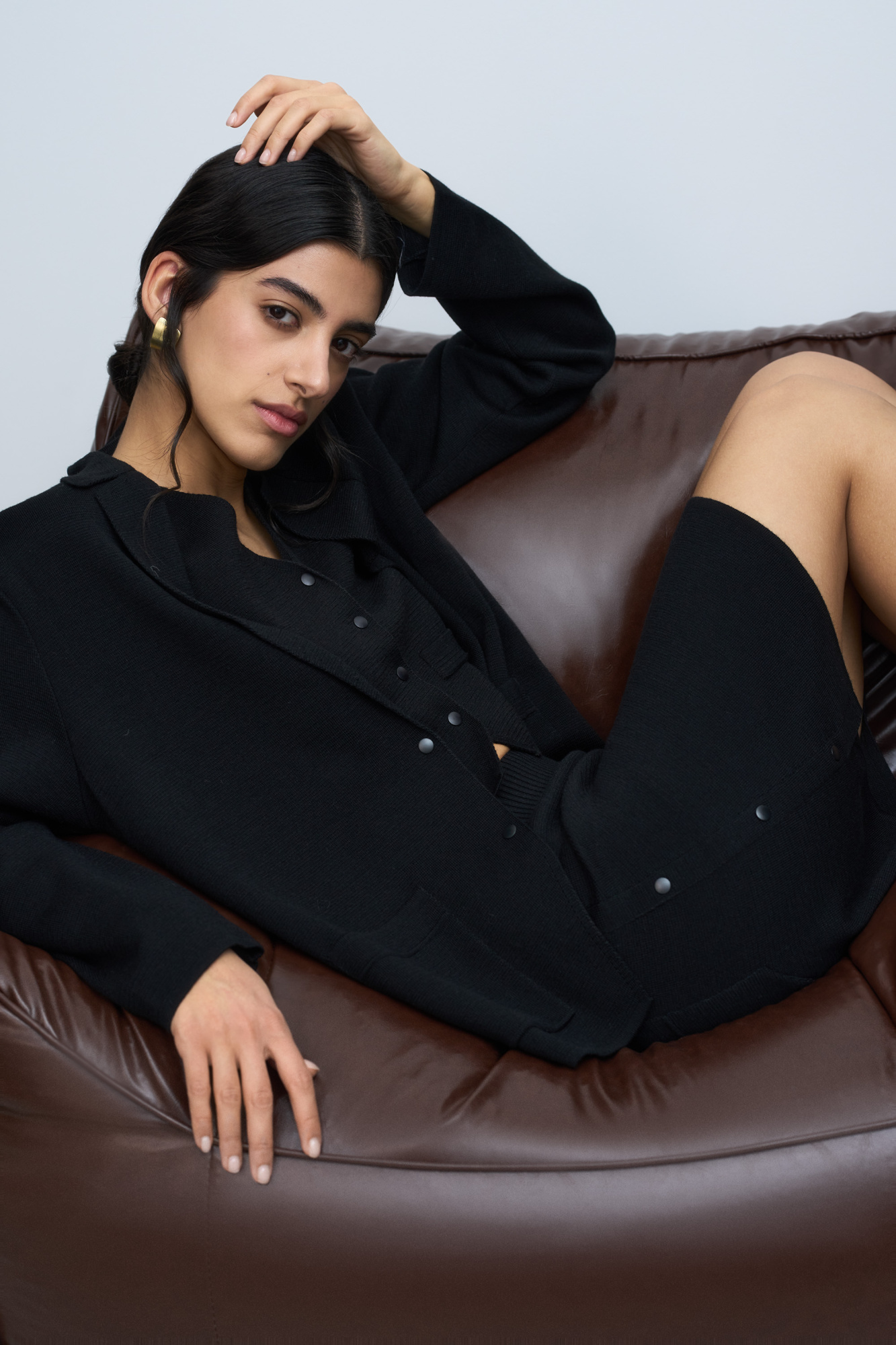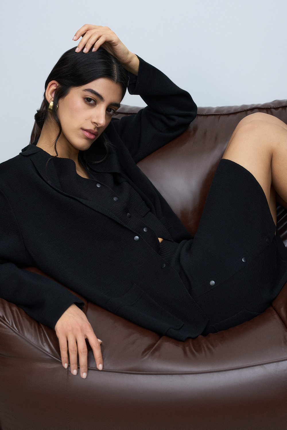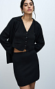 Merino wool knit mini skirt with a side snap closure, a small cutout on the side and patch pockets at the back. Ribbed elastic waistband. You can complete the look with a matching vest and jacket.