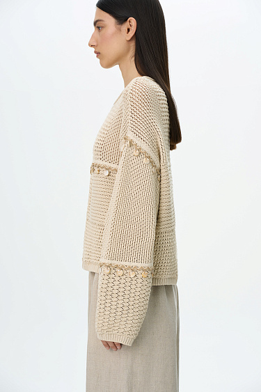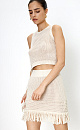 100% cotton knit mini skirt with fringe at the hem. You can complete the look with a top in the same style.