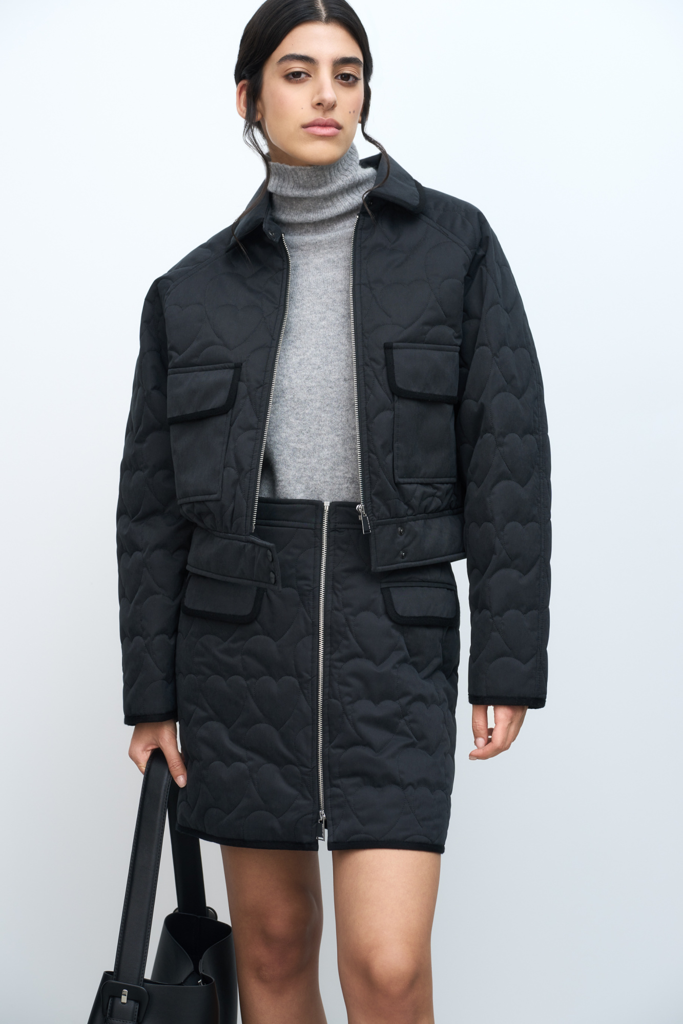Quilted mini skirt. Fitted silhouette with front pockets and heart shape stitches. You can complete the look with a bomber jacket in the same style.
