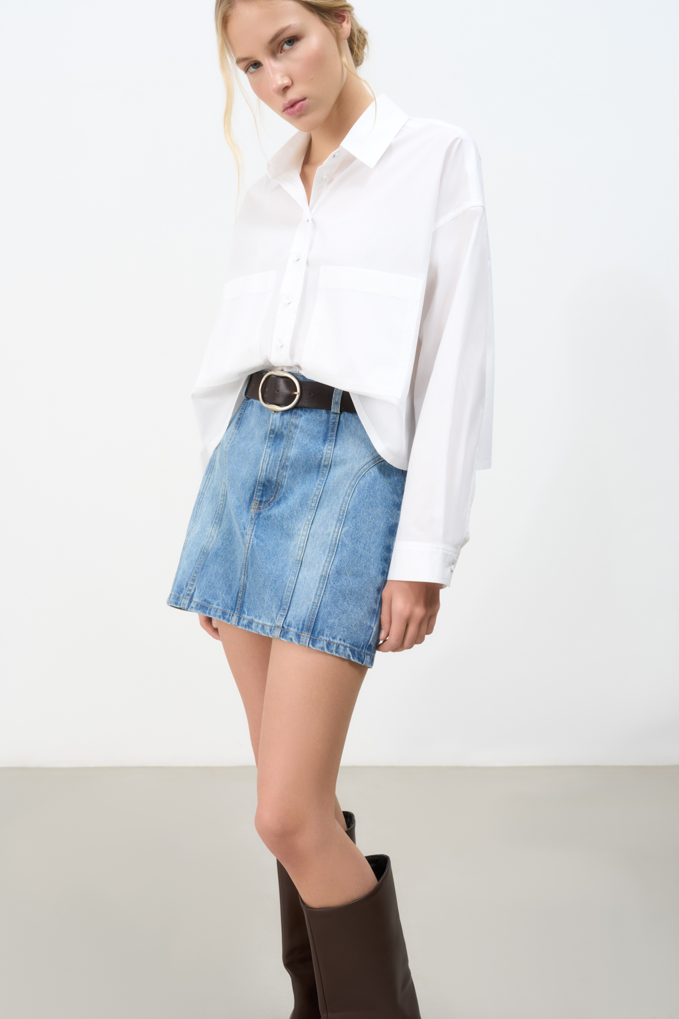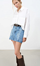 Denim skirt with raised seams. Model of a fitted silhouette, mini length. You can complement the look with a top in the same style.