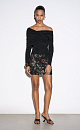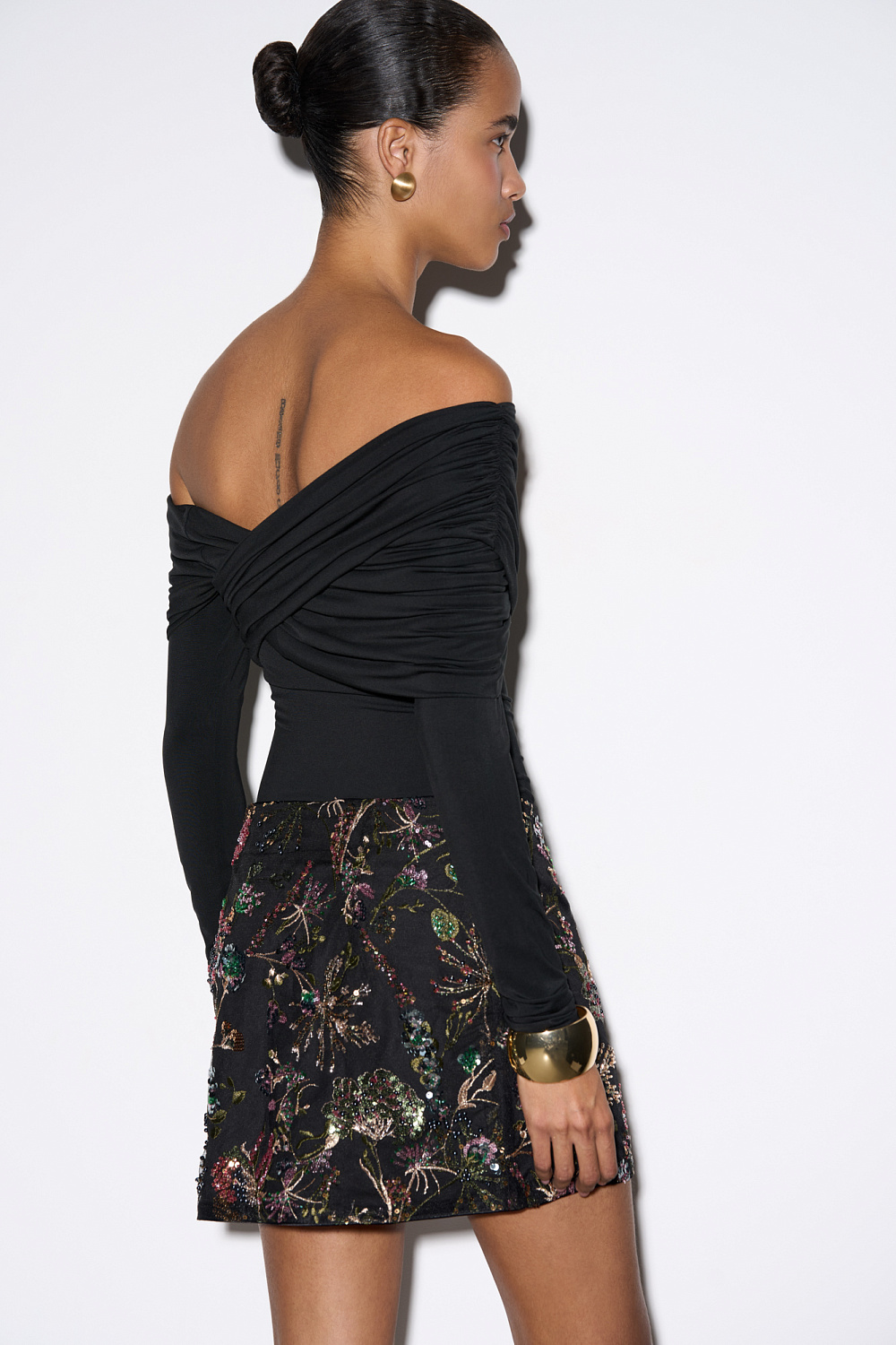 Mini-length skirt with floral patterns embroidered with sequins and beads. Concealed zip fastening. The product is lined.