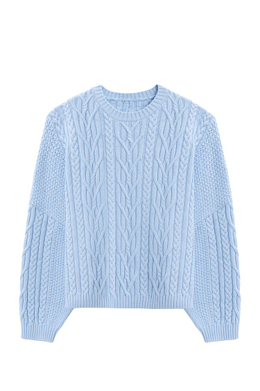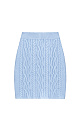 Knitted mini skirt made of viscose and cotton. Model with a wide elastic waistband. The product is decorated with textured knitting in the form of braids of different thicknesses. The edges are ribbed.