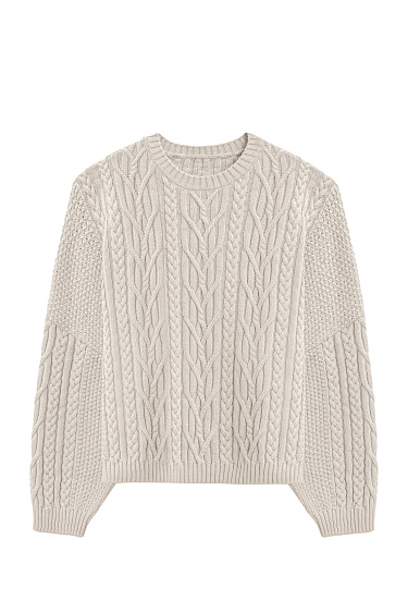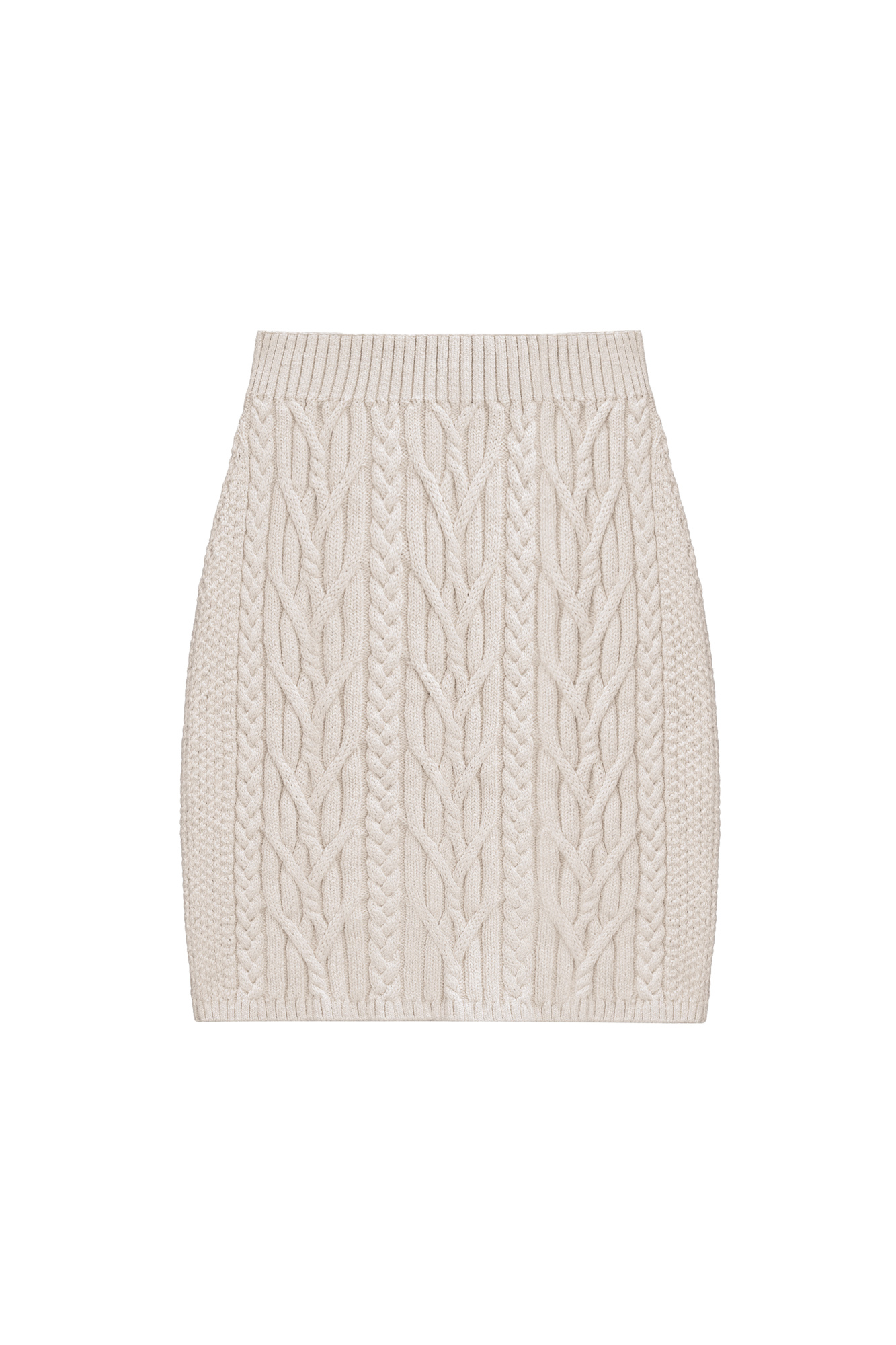 Knitted mini skirt made of viscose and cotton. Model with a wide elastic waistband. The product is decorated with textured knitting in the form of braids of different thicknesses. The edges are ribbed.