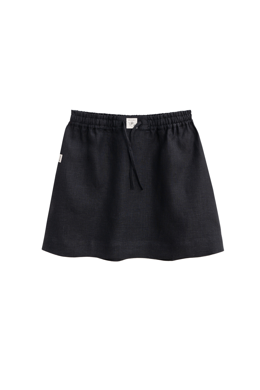 Mini length skirt made of 100% linen. A-line model with a wide elastic waistband with a drawstring. The product is decorated with a branded label.