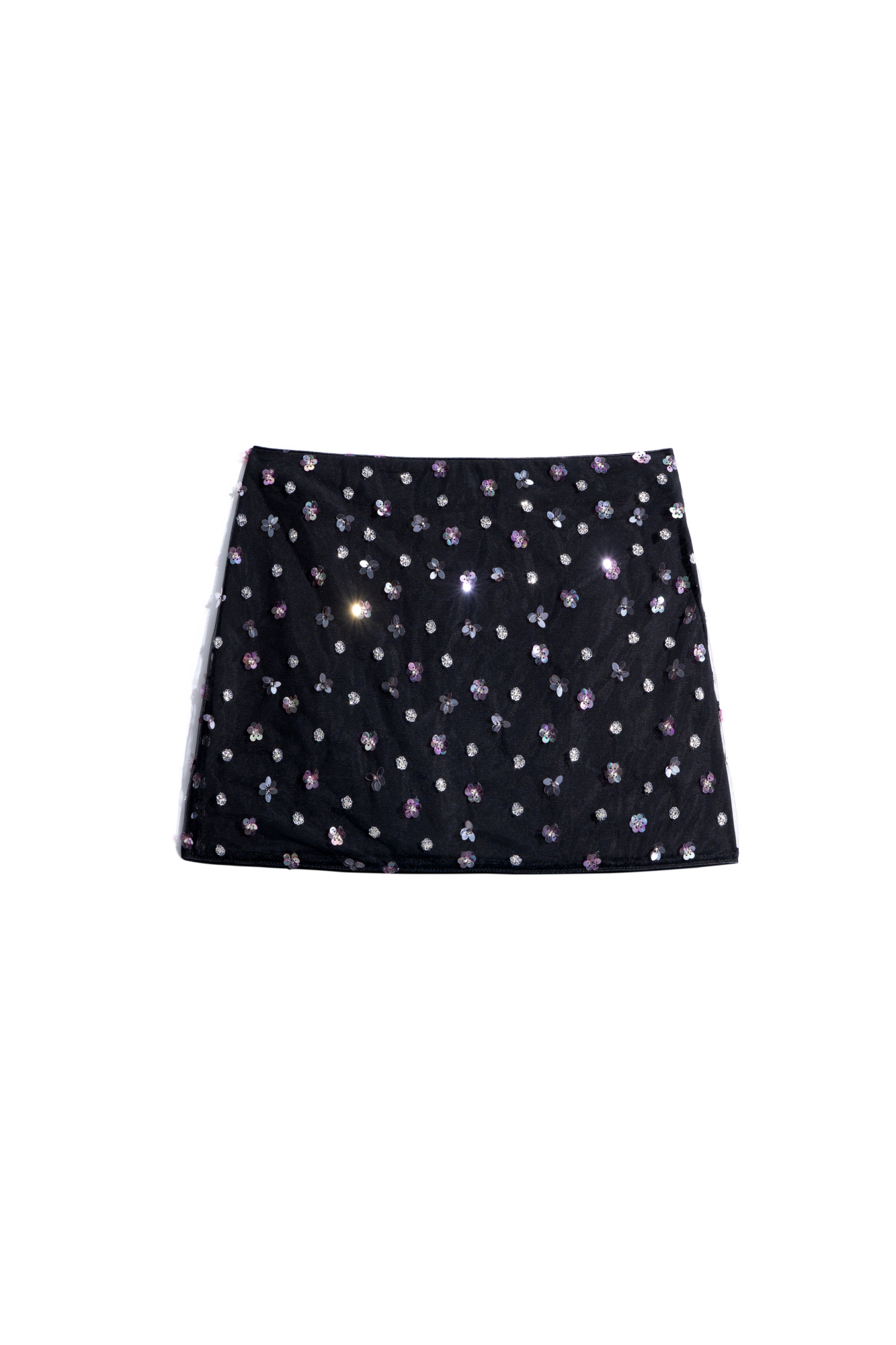 Mini-length skirt, embroidered with sequins and beads. Concealed zip fastening. The product is lined.