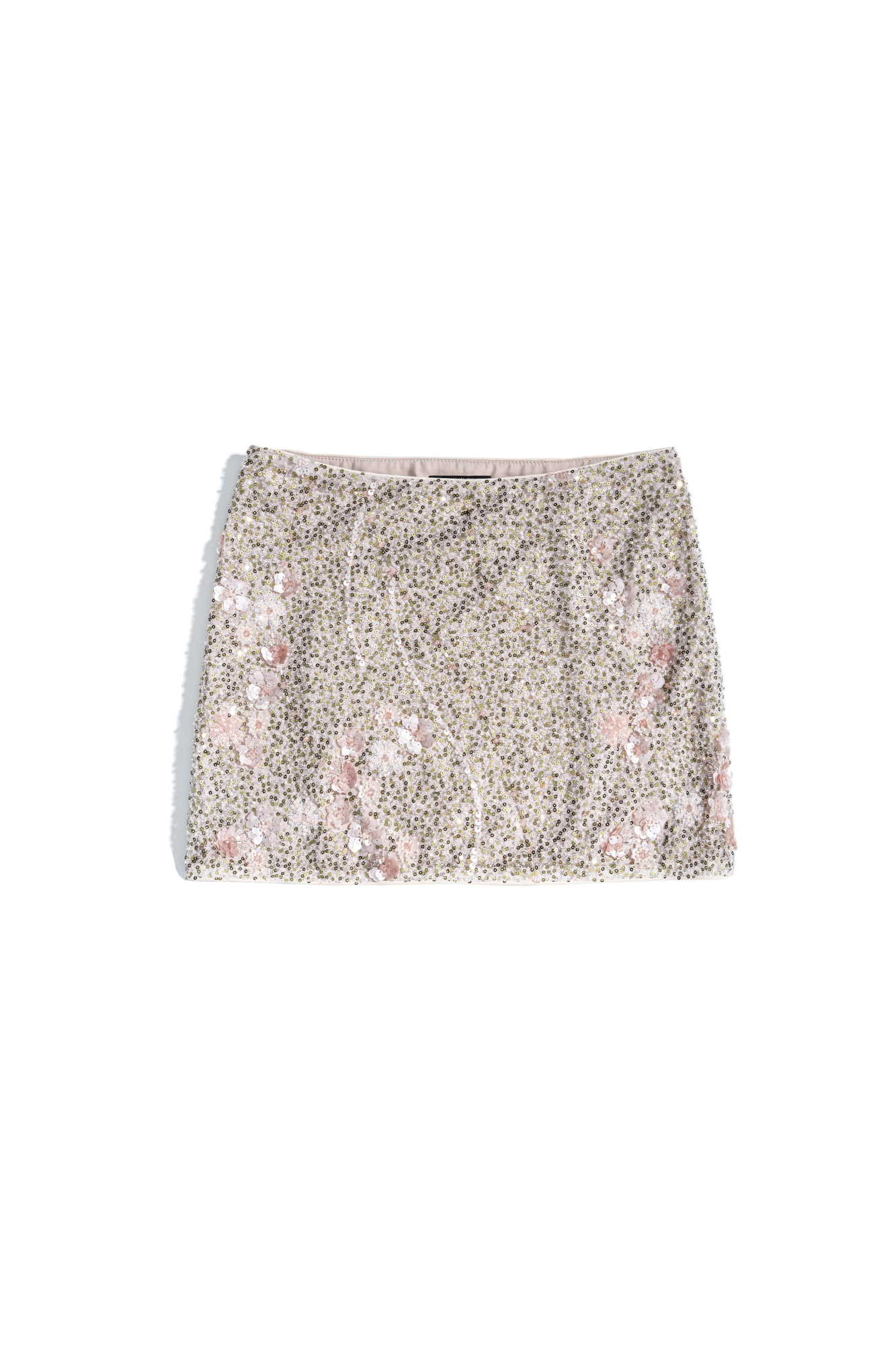 Mini-length skirt with voluminous floral patterns embroidered with sequins and beads. Concealed zip fastening. The product is lined.