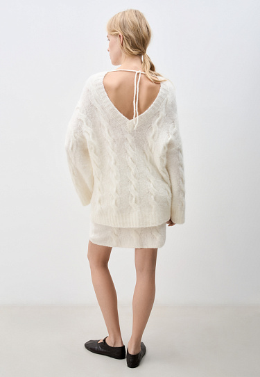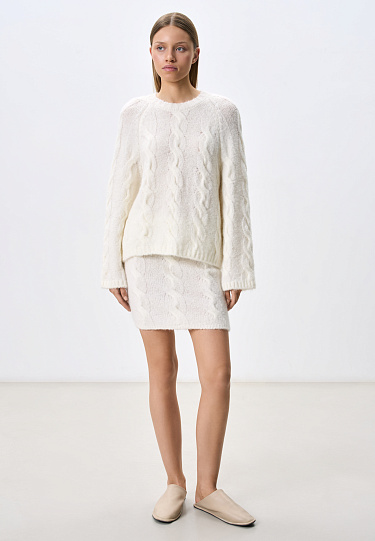 Knitted mini skirt with braids made of wool and mohair. Fitted silhouette with elastic ribbed waistband.