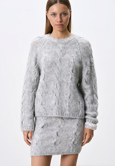 Knitted mini skirt with braids made of wool and mohair. Fitted silhouette with elastic ribbed waistband.