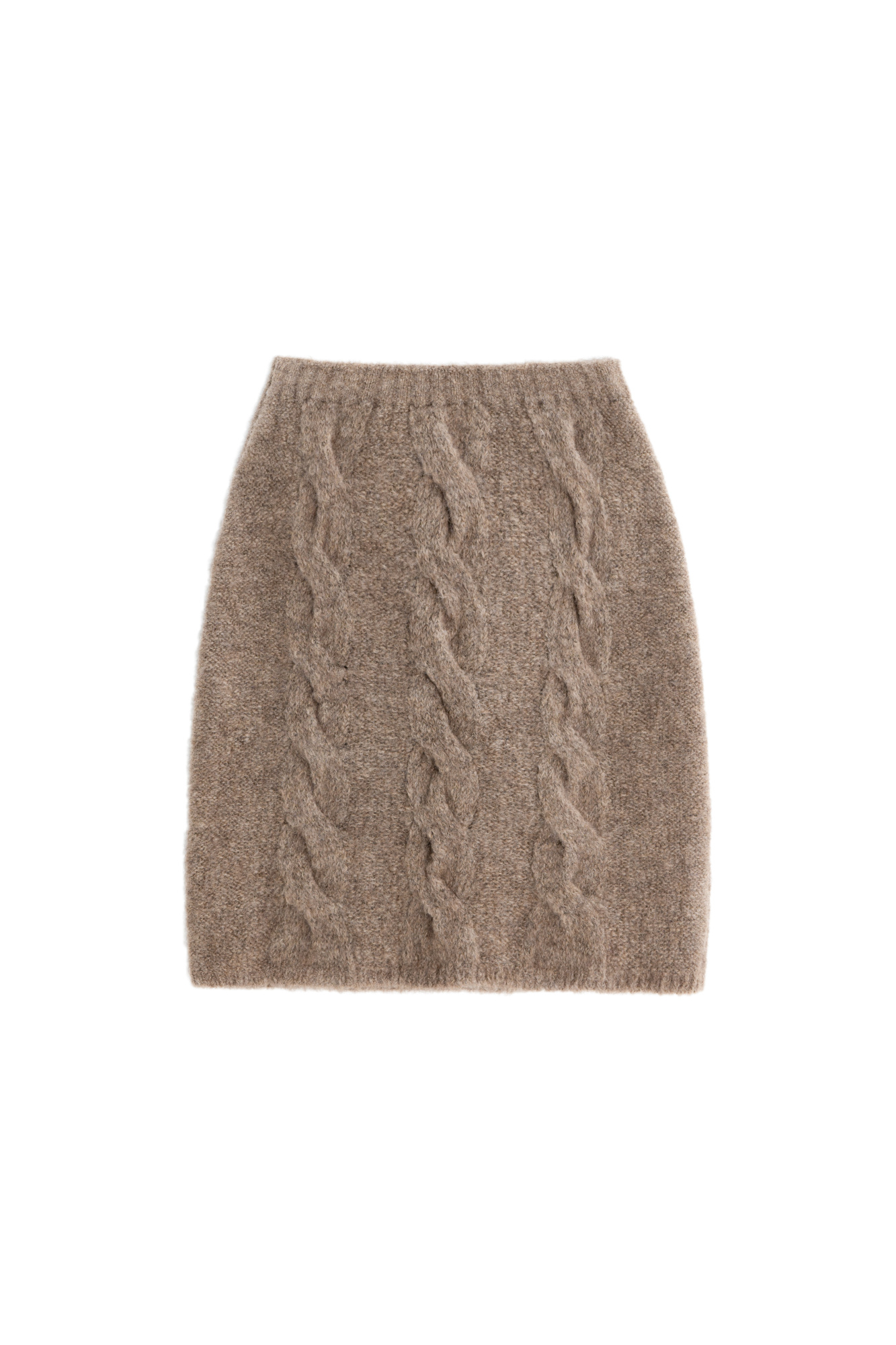 Knitted mini skirt with braids made of wool and mohair. Fitted silhouette with elastic ribbed waistband.