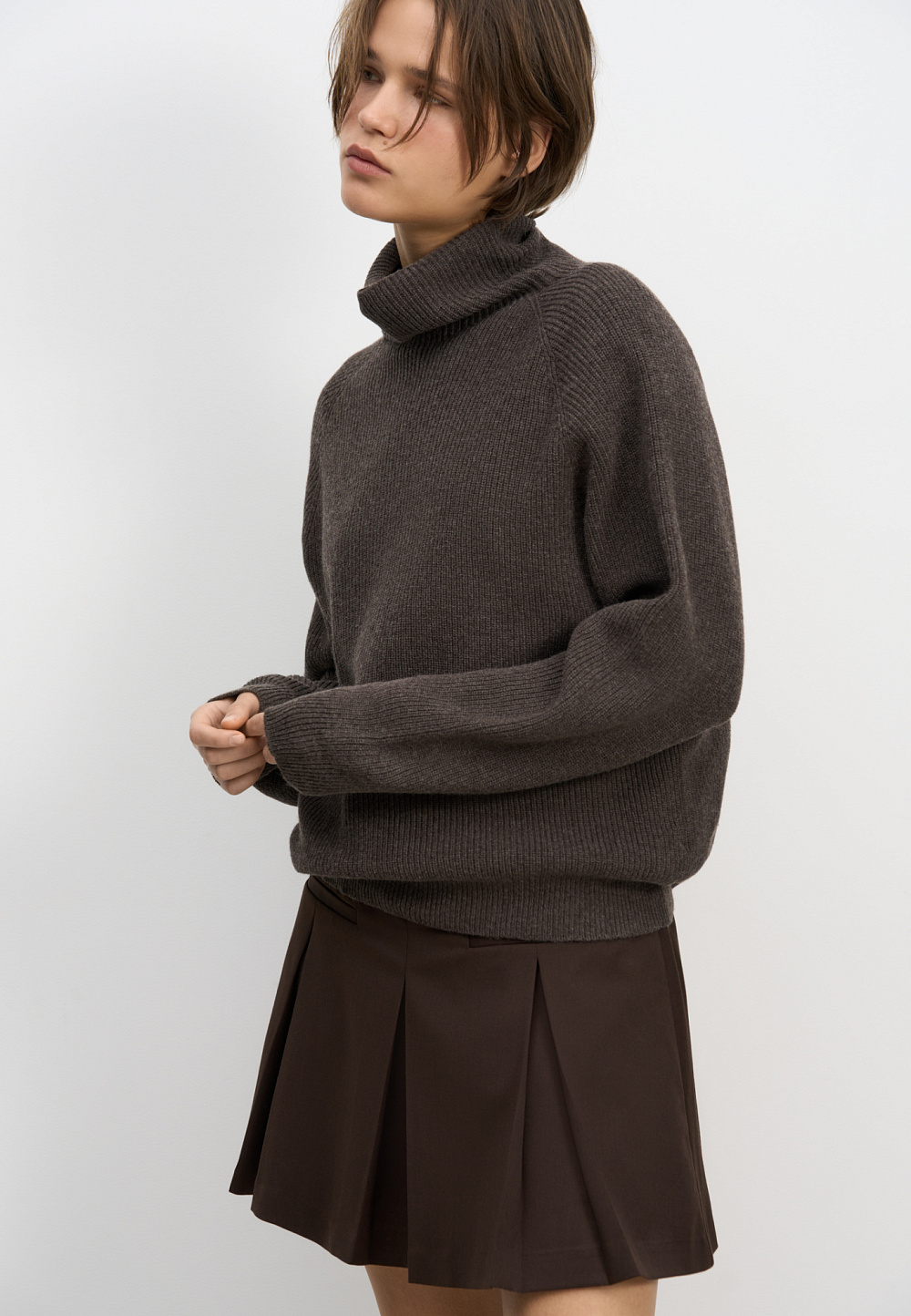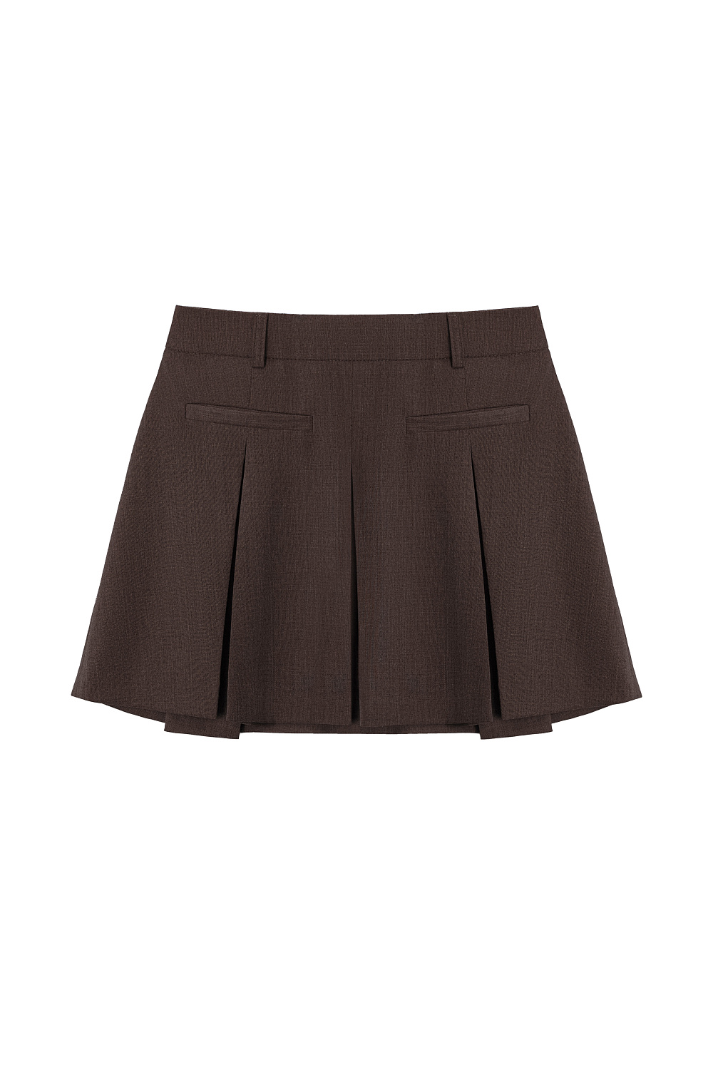 Mini skirt made of wool. The model has a straight fit, large pleats, a waistband with belt loops, front slash pockets and a zipper closure. The product is unlined.