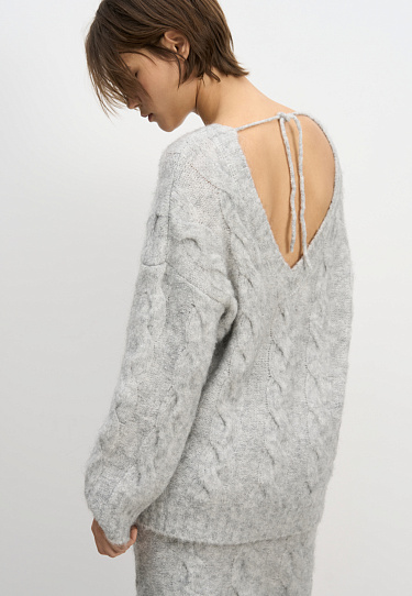 Mini-length knitted skirt with voluminous braids made of soft wool. Wide elastic waistband with drawstring. You can complement the look with a jumper in the same style.