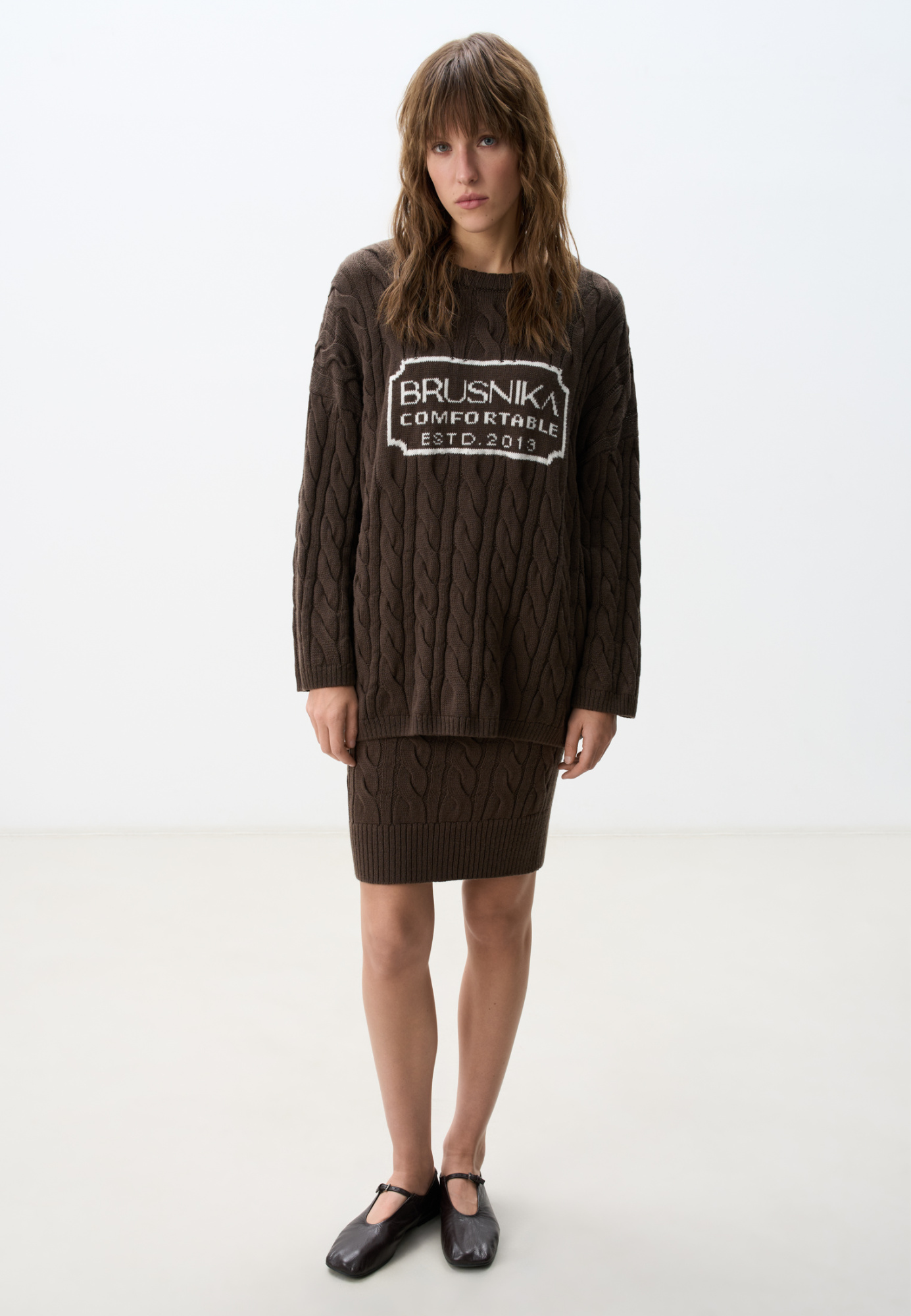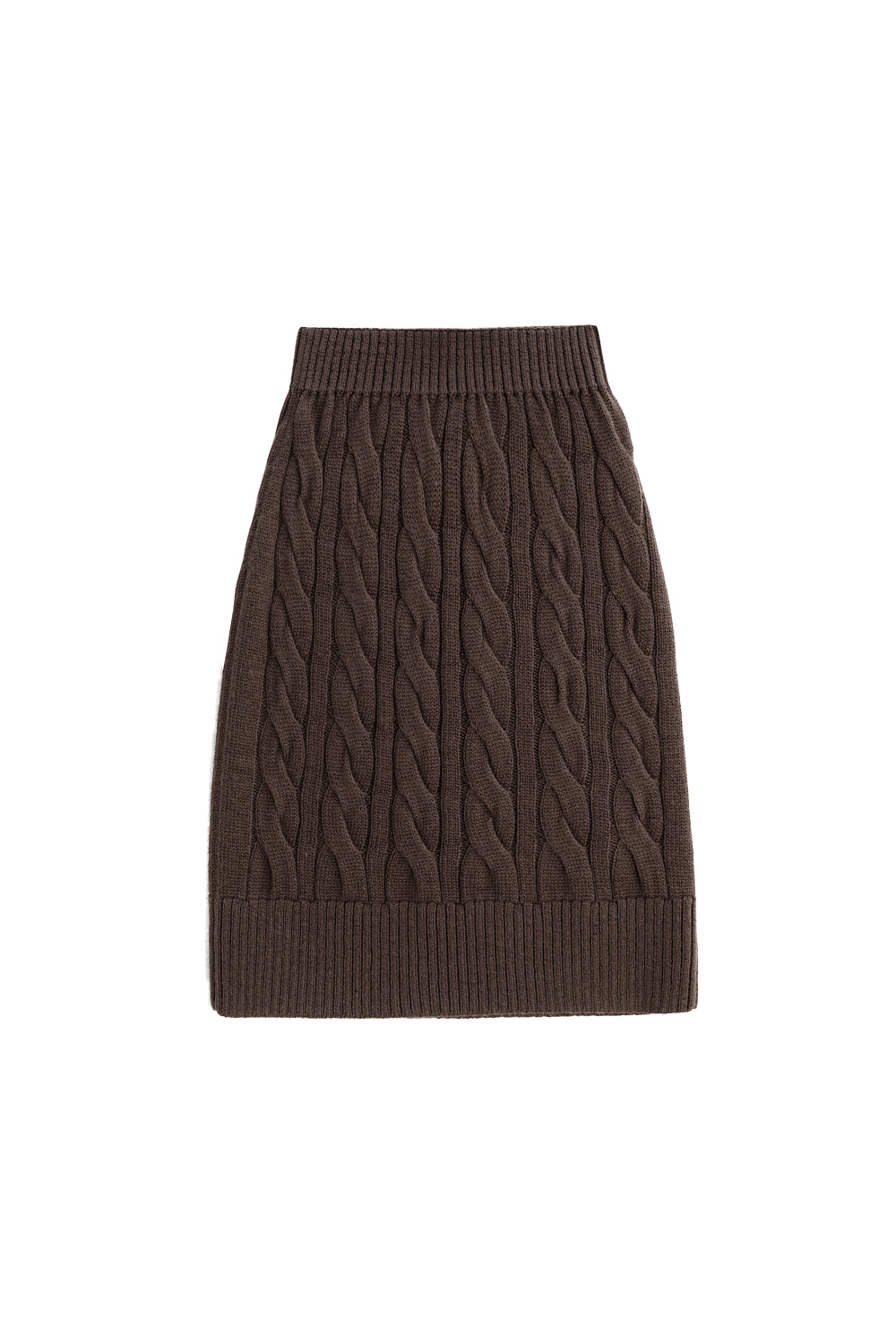 Mini-length knitted skirt with voluminous braids made of soft wool. Wide elastic waistband with drawstring. You can complement the look with a jumper in the same style.