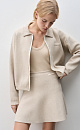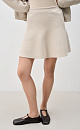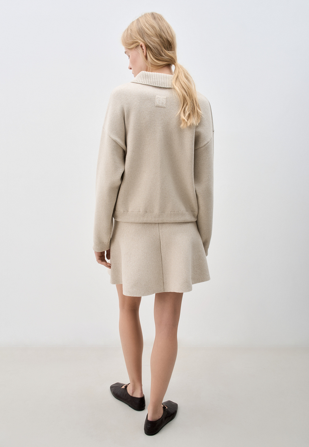 Knitted mini skirt made of cashmere and wool. Half-sun model, with an elastic waistband, thin stripes of a contrasting color and branded jacquard. You can complement the look with a bomber jacket in the same style.