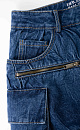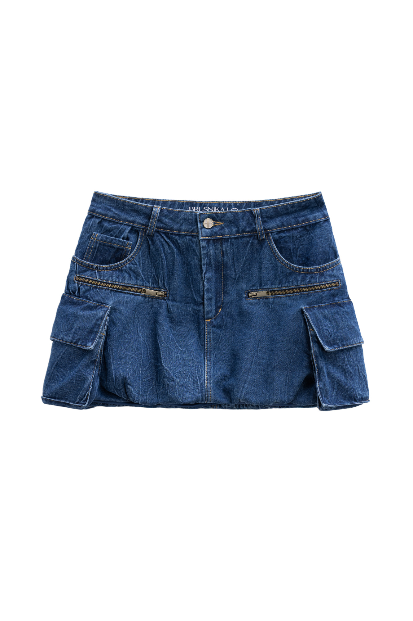 A denim miniskirt made from 100% cotton. It features large patch pockets with flaps on the sides, welt pockets, belt loops on the waistband, and a zip and button closure.