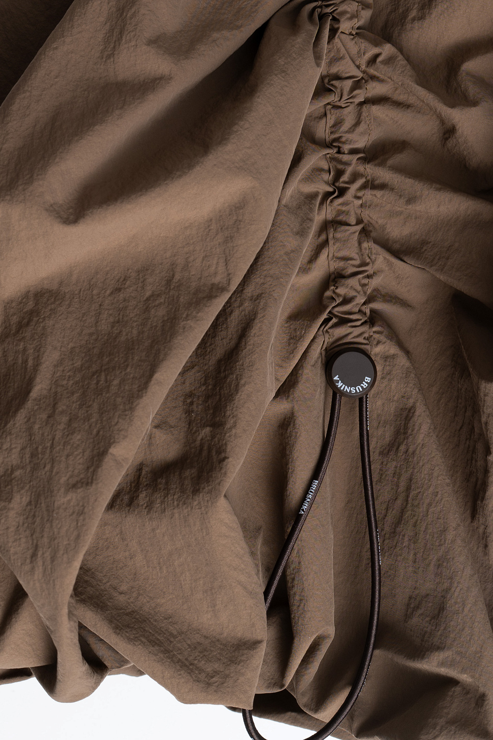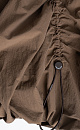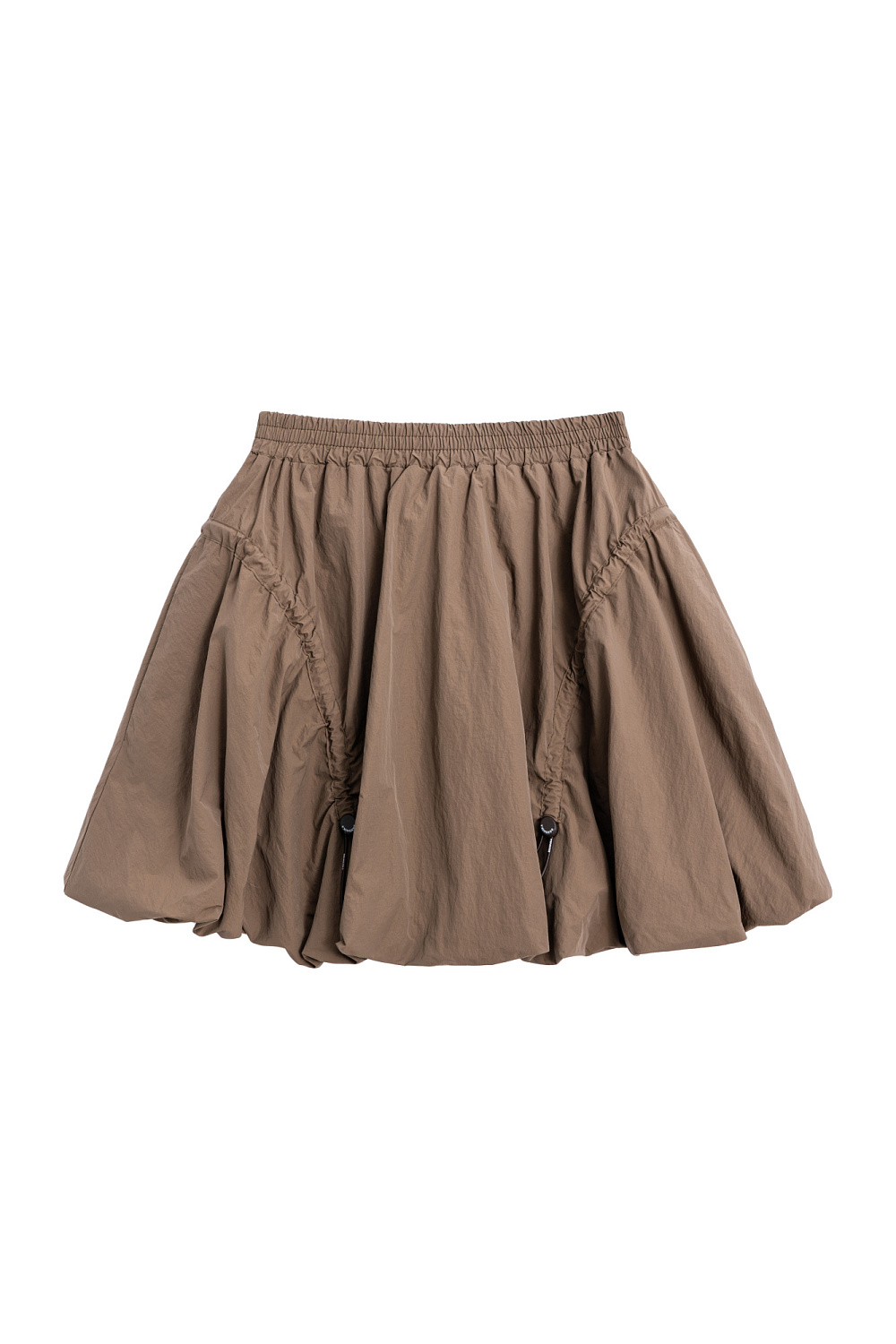 Mini-length balloon skirt made of nylon. Model with an elasticated waistband and adjustable frills on the sides.