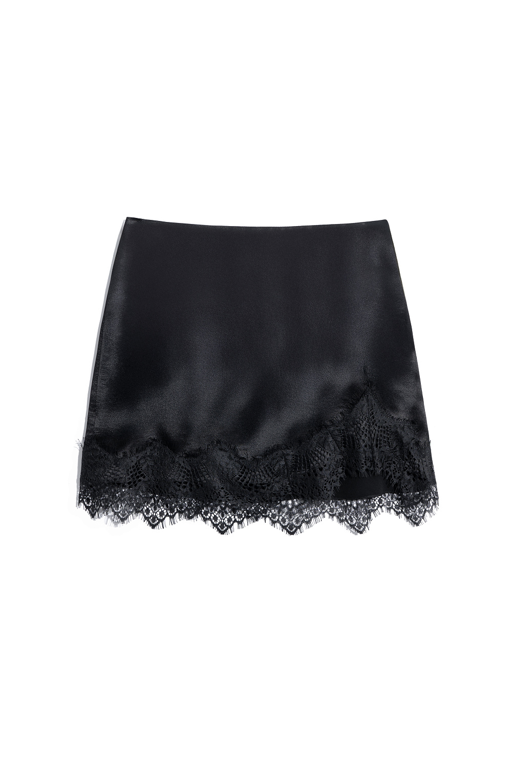 Mini length satin skirt. Model with an asymmetrical hem decorated with lace. Concealed zip fastening.