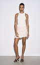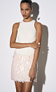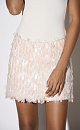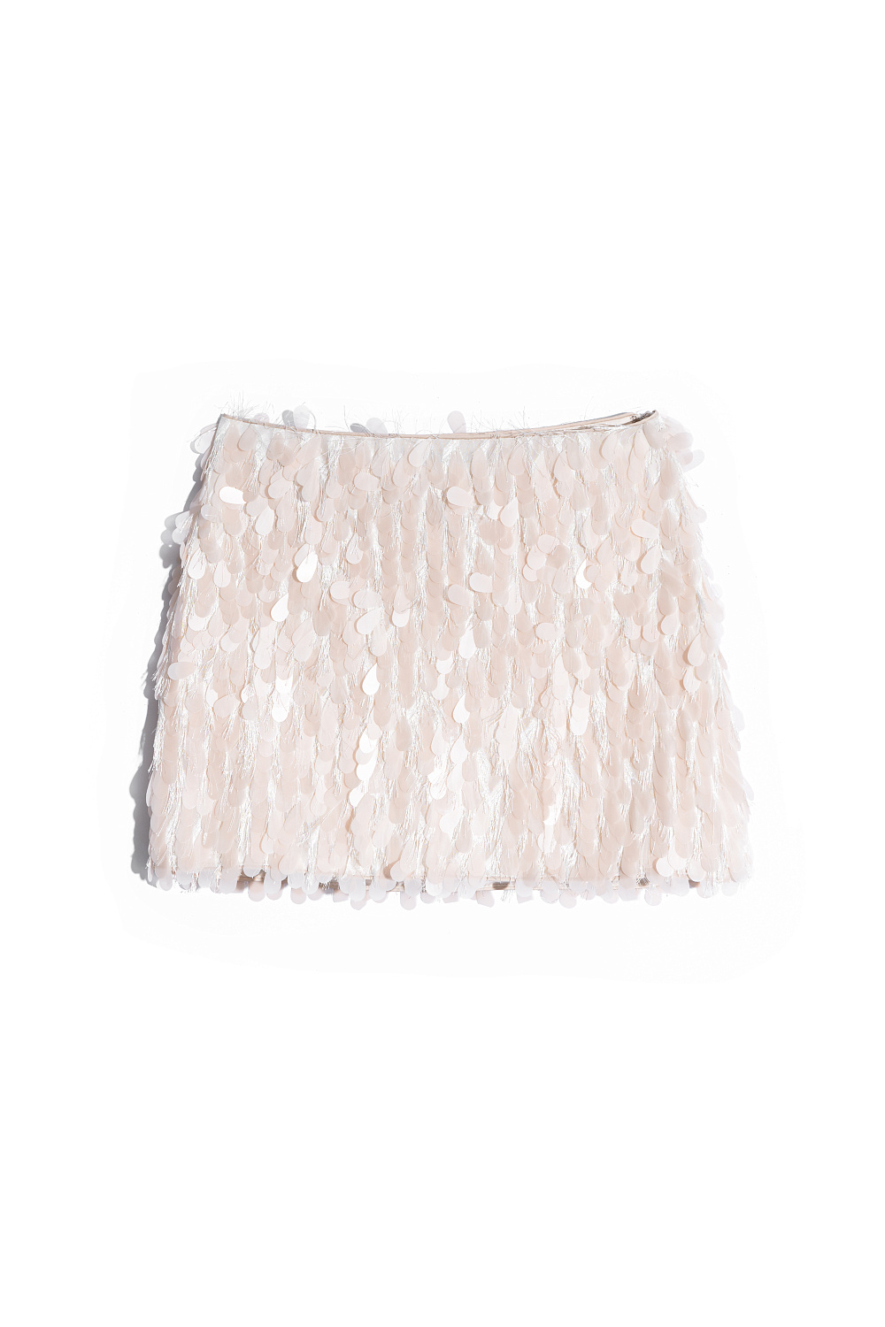 Mini-length evening skirt, decorated with large sequins and fringe. The product is lined. Side zip fastening and hidden hook.
