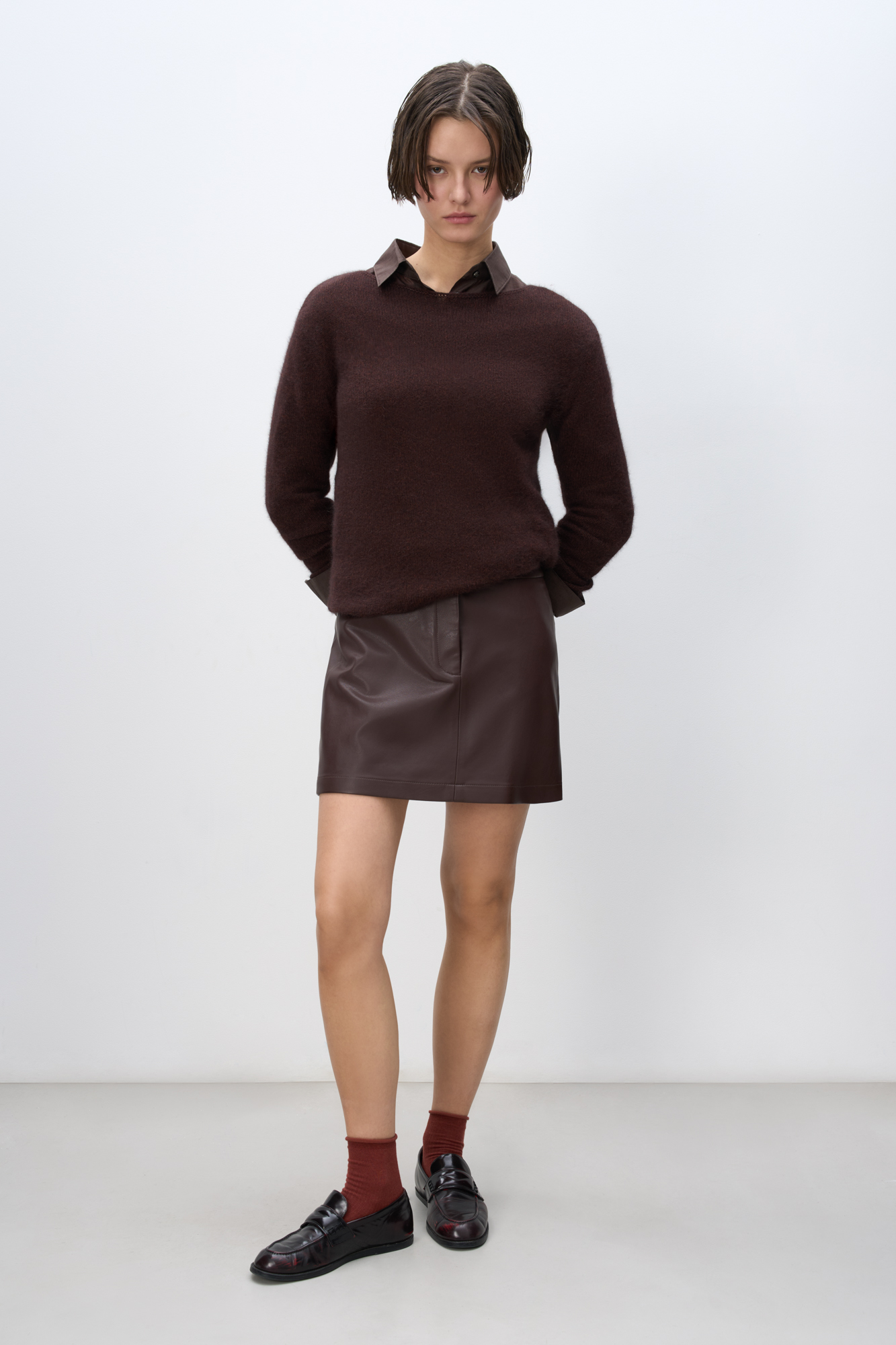 Mini-length skirt made of eco-leather. The model is lined. Zip closure, hidden button and hook.