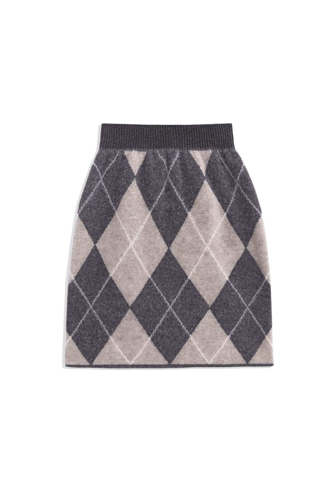 Knitted mini skirt made of wool and cashmere with an argyle pattern. Fitted with a wide ribbed elastic waistband.