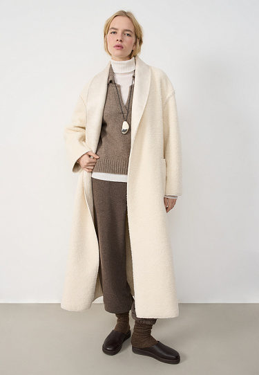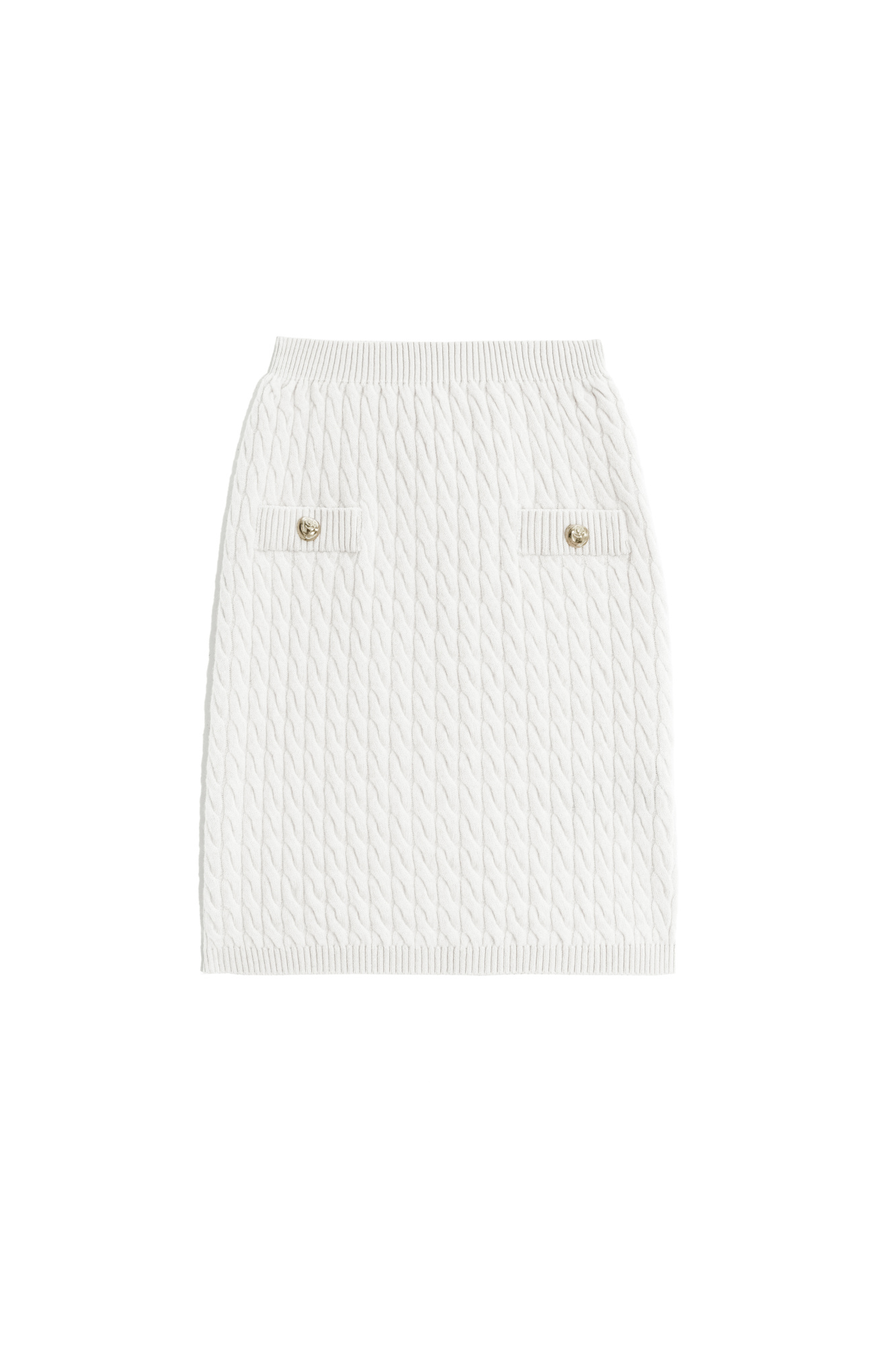 Mini-length skirt made of 100% extrafine merino wool, made with knitted braids. Fitted with a ribbed elastic waistband. Imitation pockets with flaps. The product is decorated with large accent buttons.
