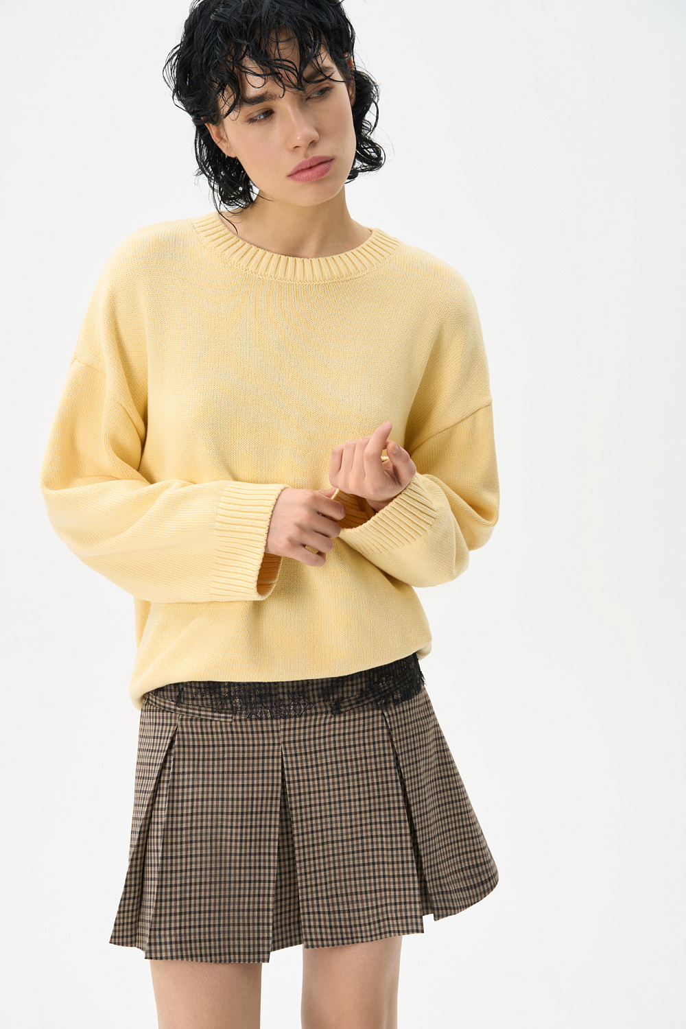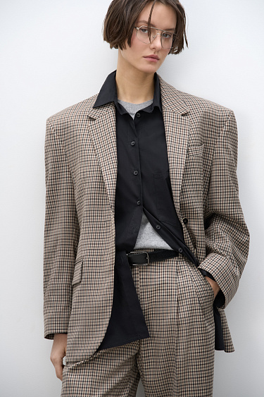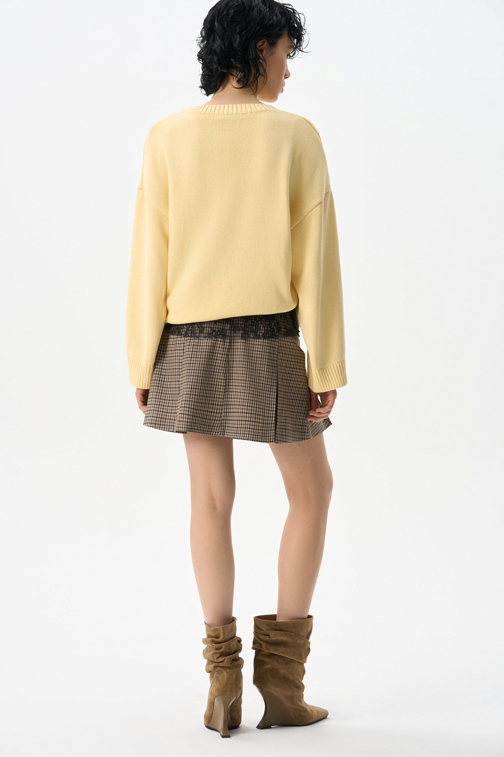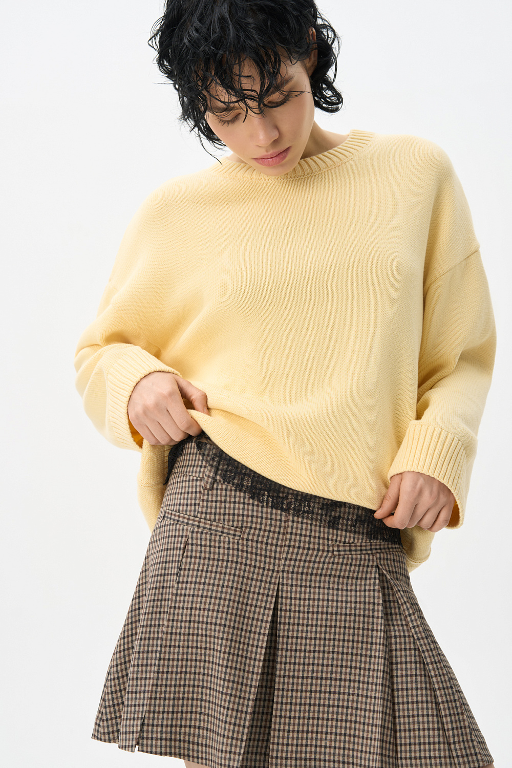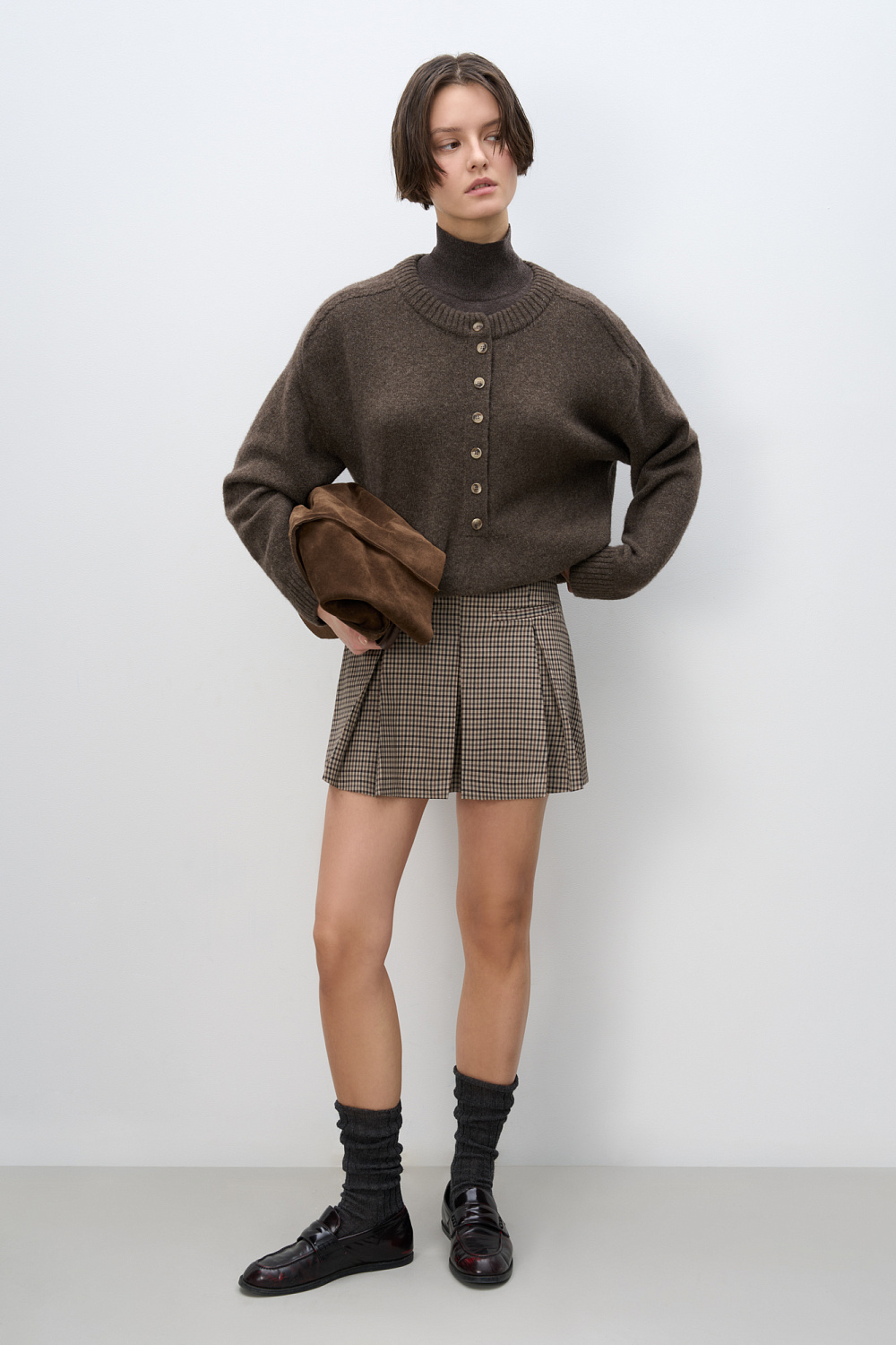 Mini skirt in Vichy check made of wool. The model has a straight fit, large pleats, a waistband with belt loops, front slash pockets and a zipper closure. The product is unlined.