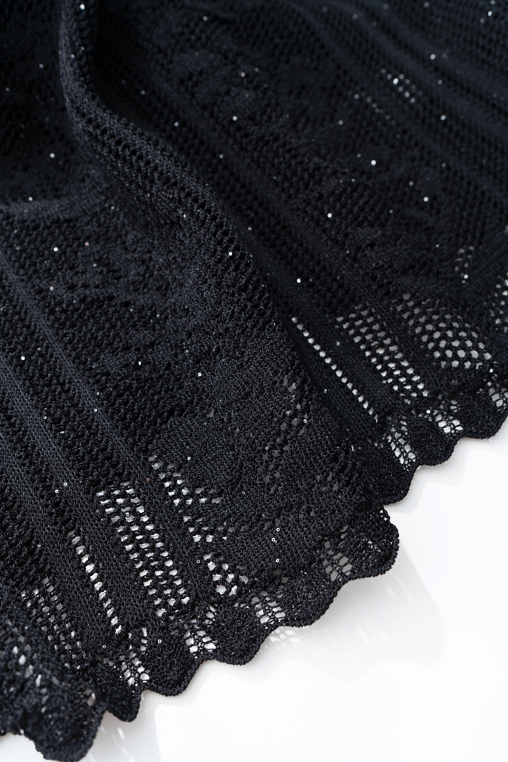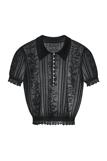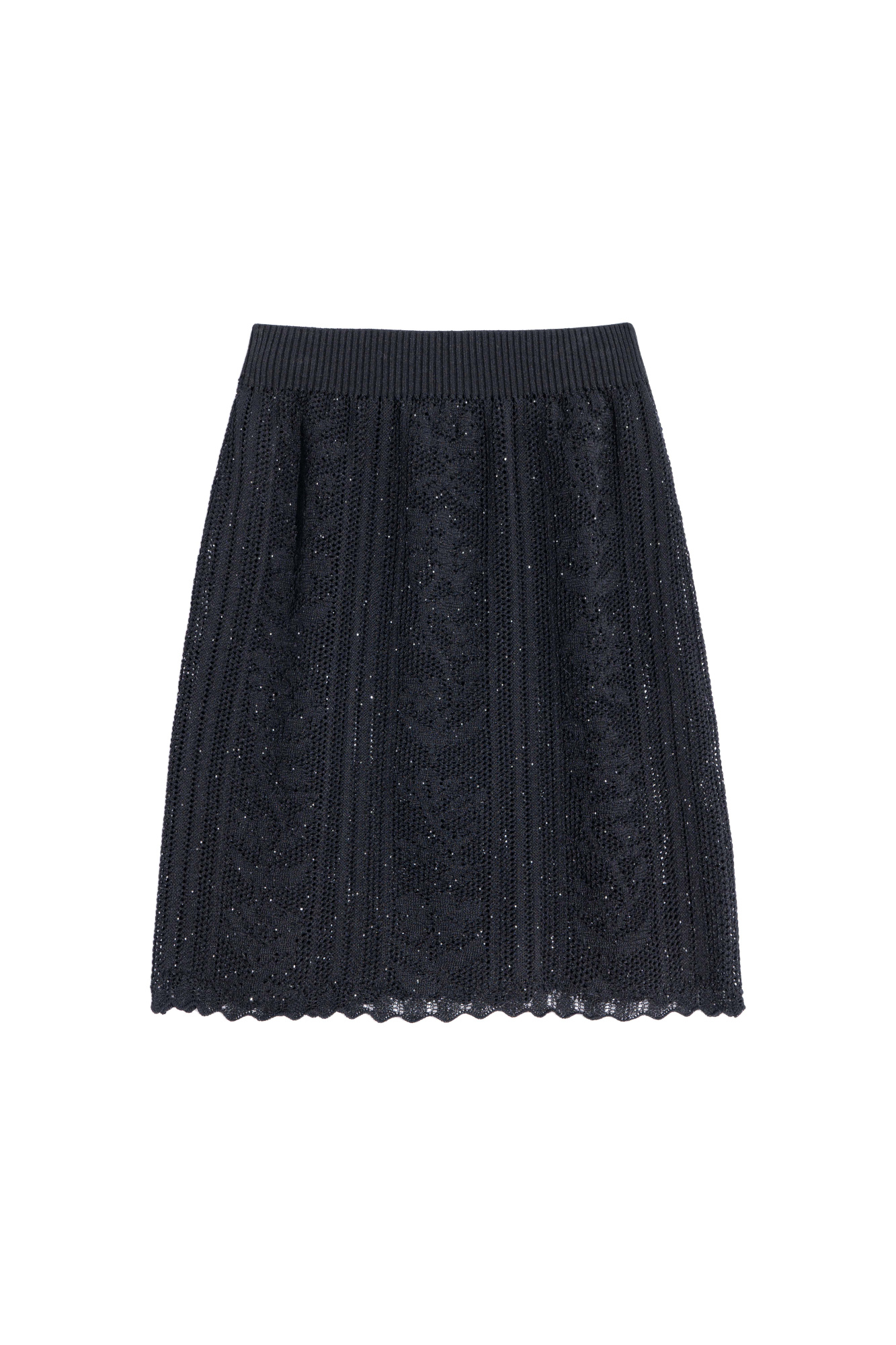 Openwork mini-length skirt made of viscose. The product is made of openwork weave with a design in the form of a floral ornament. Fitted silhouette with elastic ribbed waistband. The product is unlined.