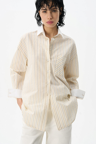 100% cotton shirt with striped print, plain cuffs and turn-down collar. Straight cut model with dropped shoulders. Shirt with two fastening options: classic and oblique.