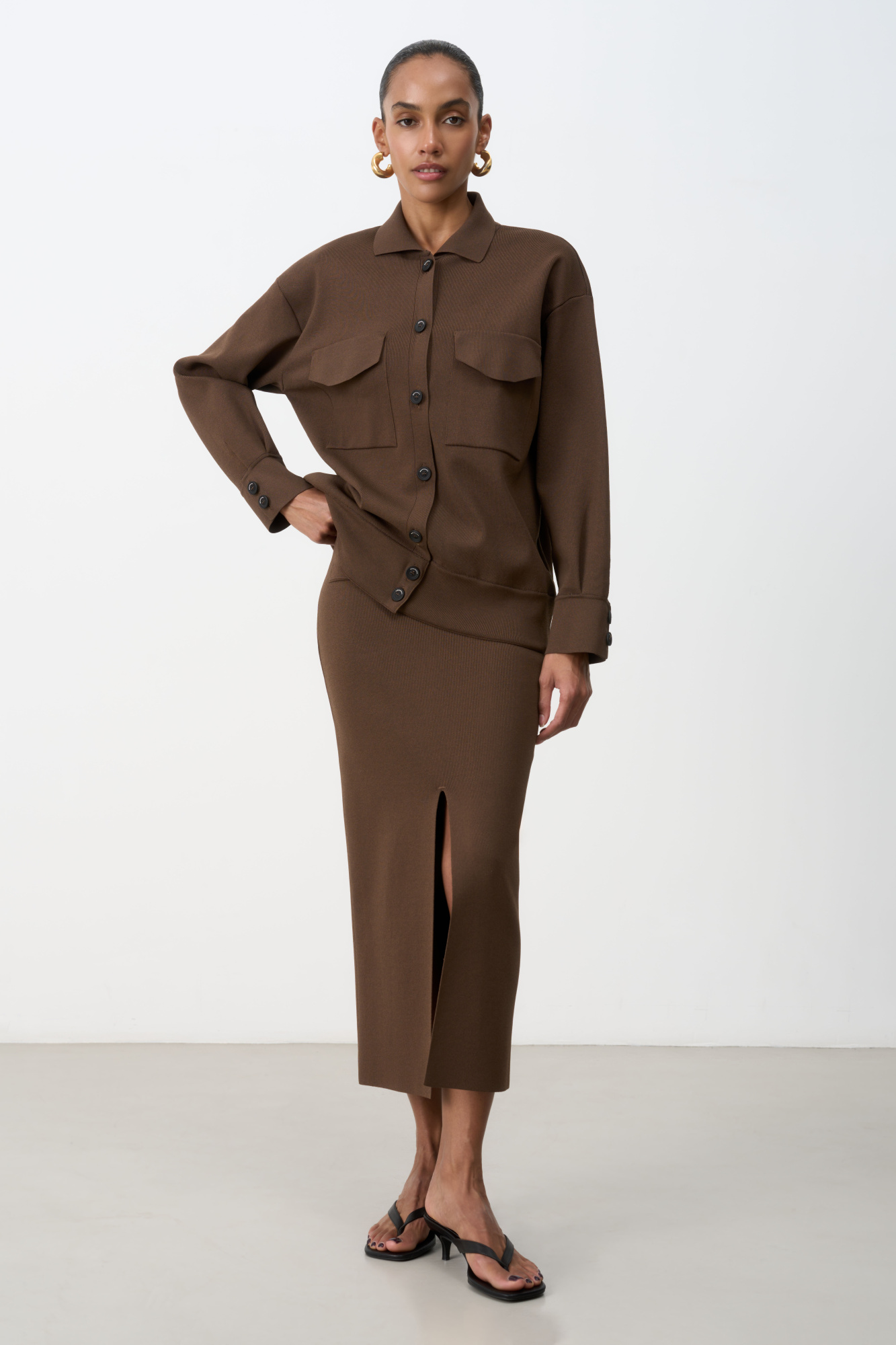 Front slit pencil skirt with pockets.
