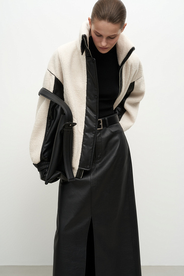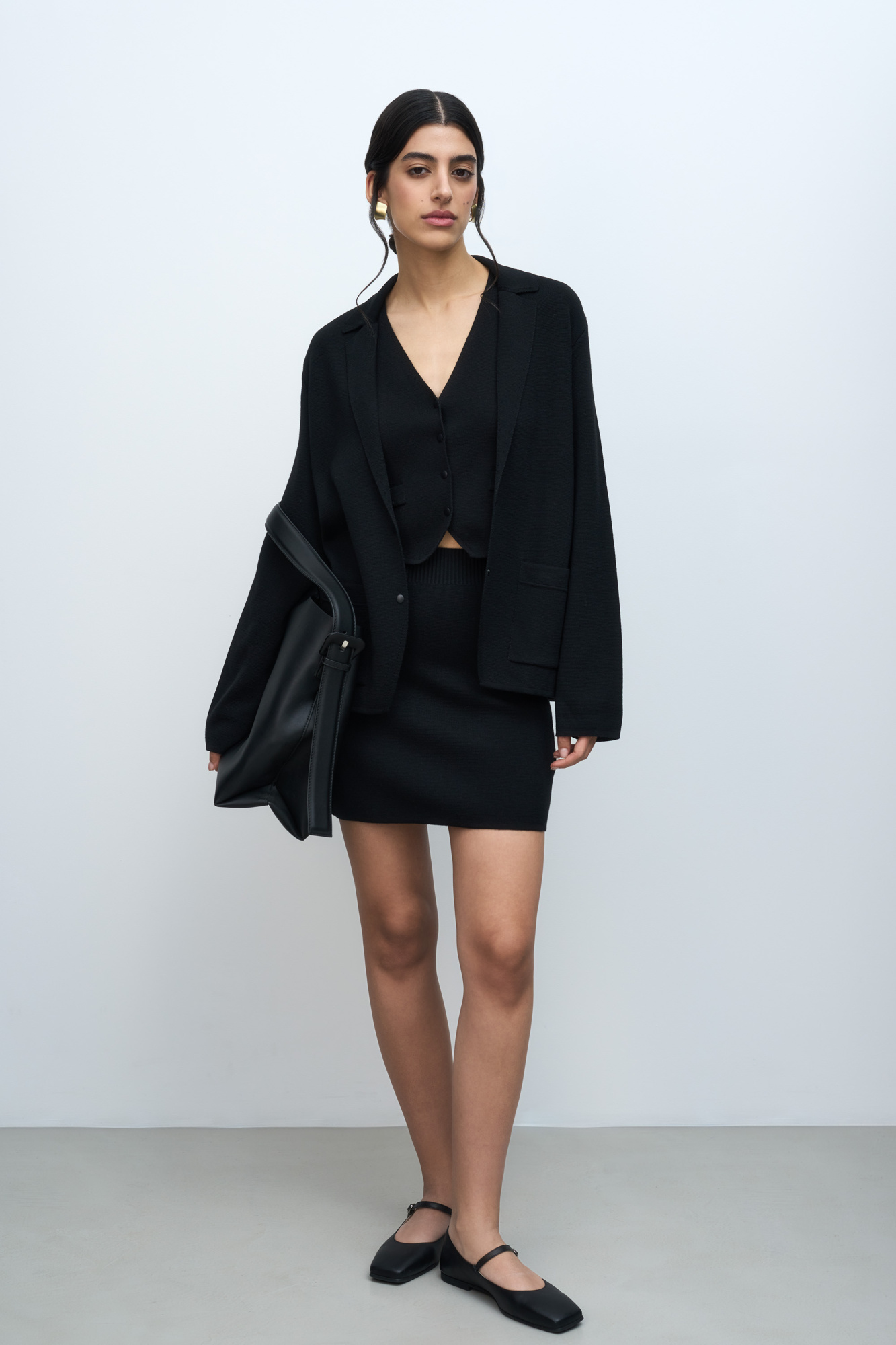 Merino wool knit mini skirt with a side snap closure, a small cutout on the side and patch pockets at the back. Ribbed elastic waistband. You can complete the look with a matching vest and jacket.