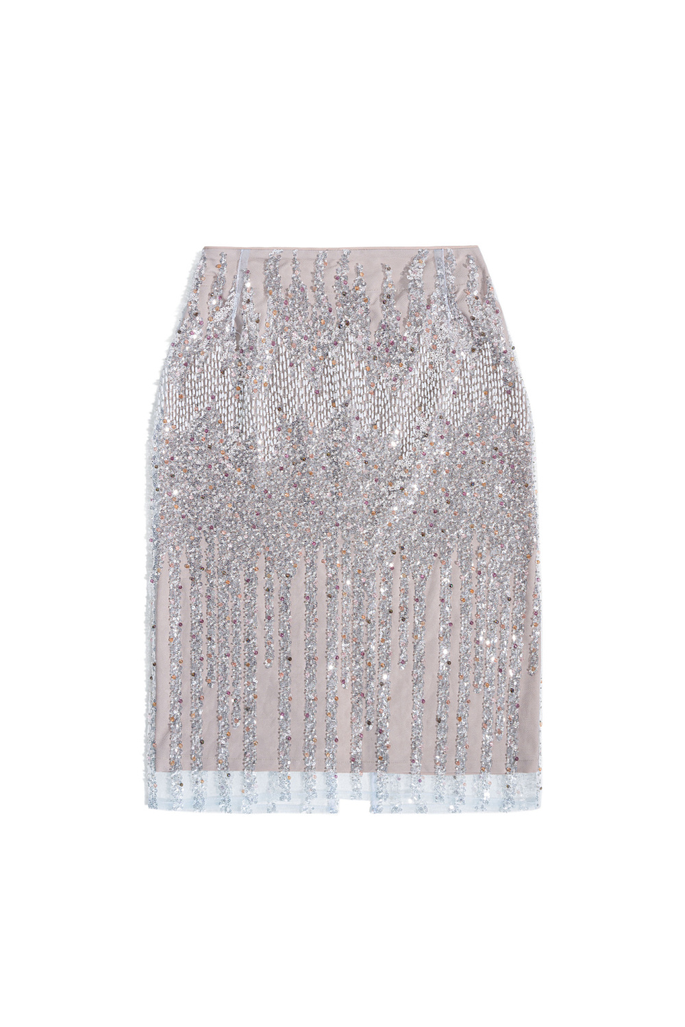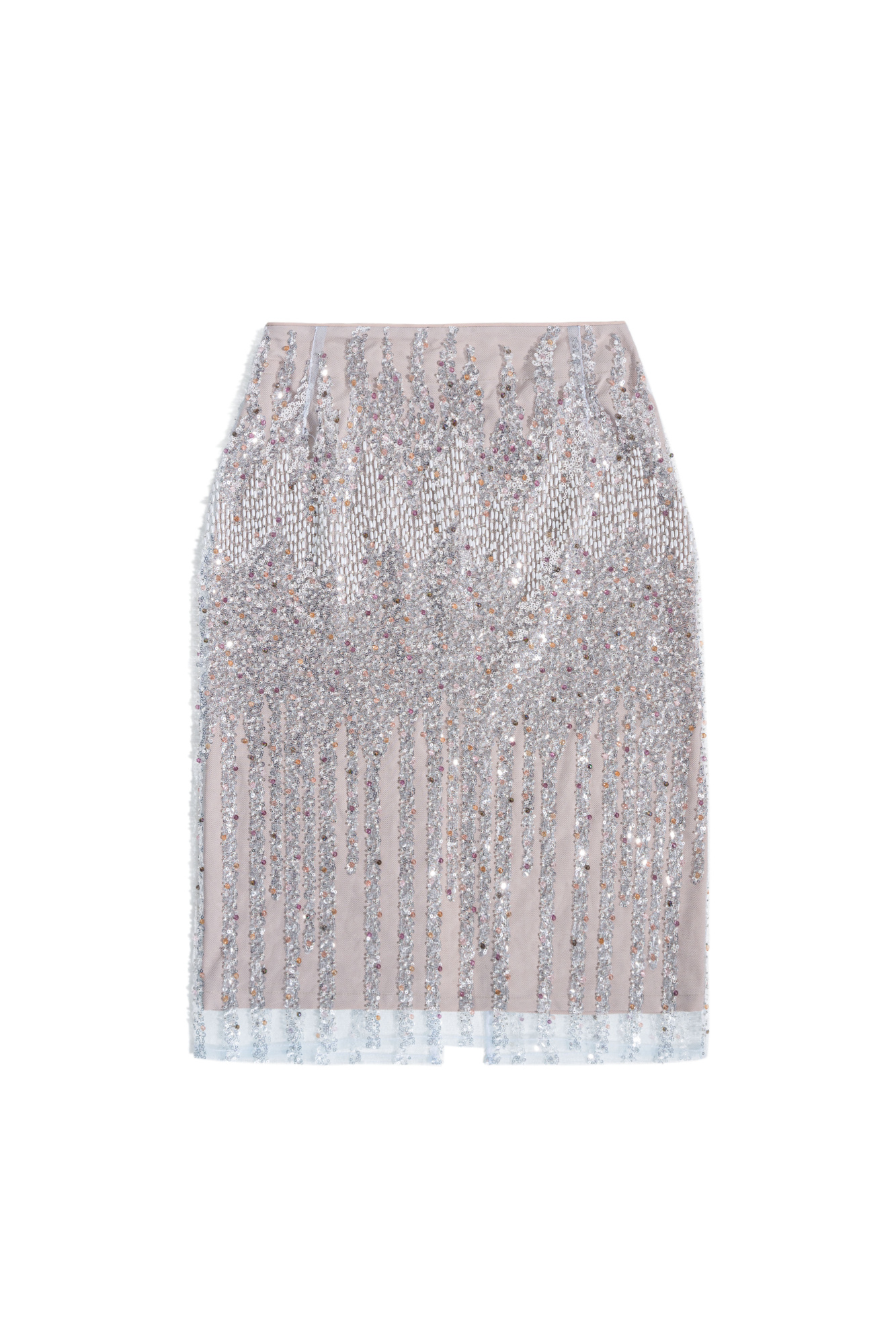 Midi length skirt decorated with sequins and beads. Model of a direct silhouette with a secret lightning fastener. The product is on the lining.