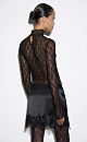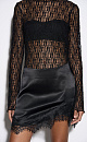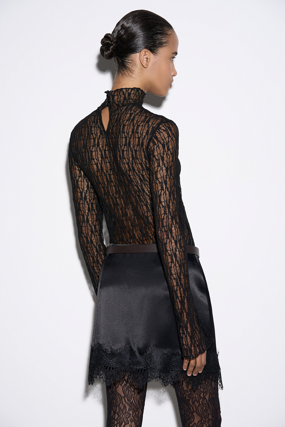Mini length satin skirt. Model with an asymmetrical hem decorated with lace. Concealed zip fastening.