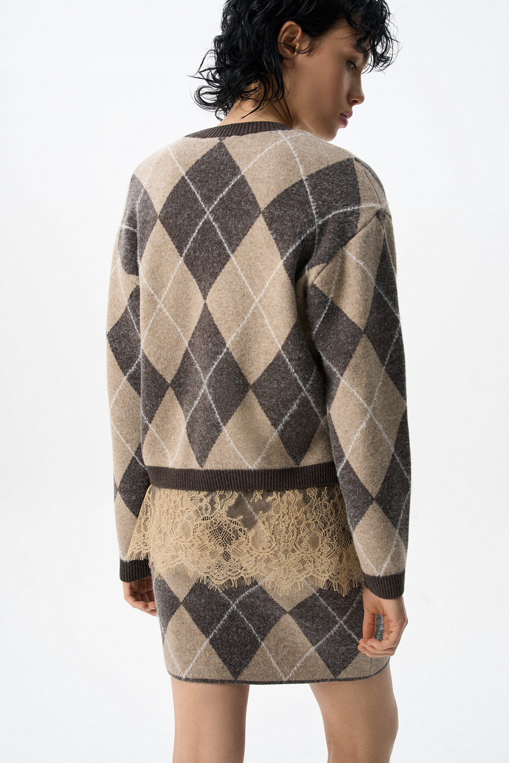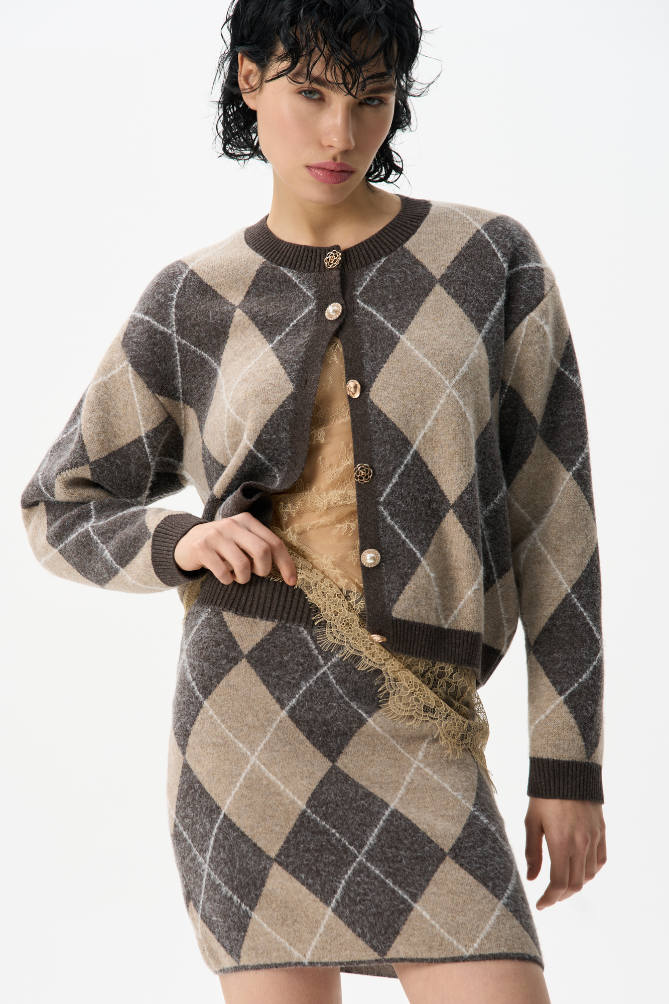 Knitted mini skirt made of wool and cashmere with an argyle pattern. Fitted with a wide ribbed elastic waistband.