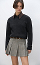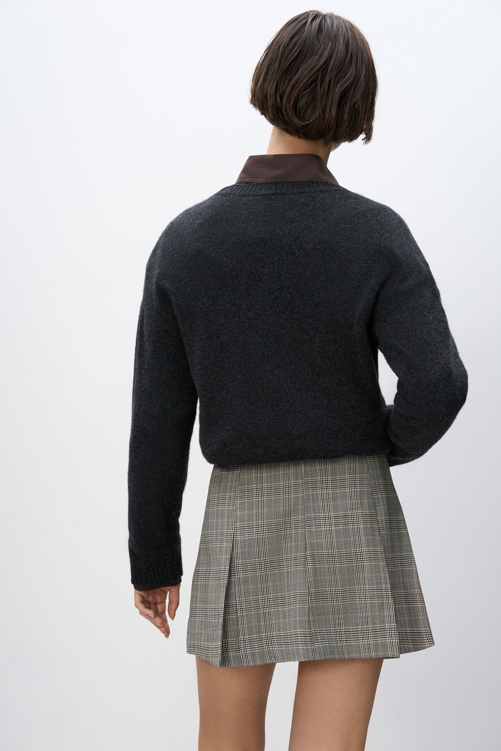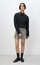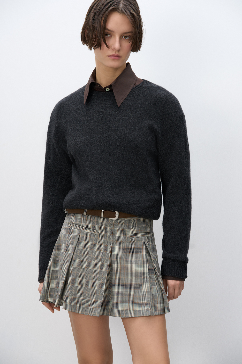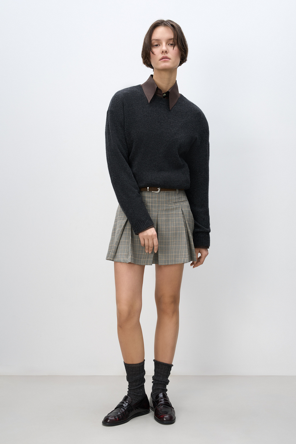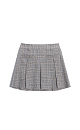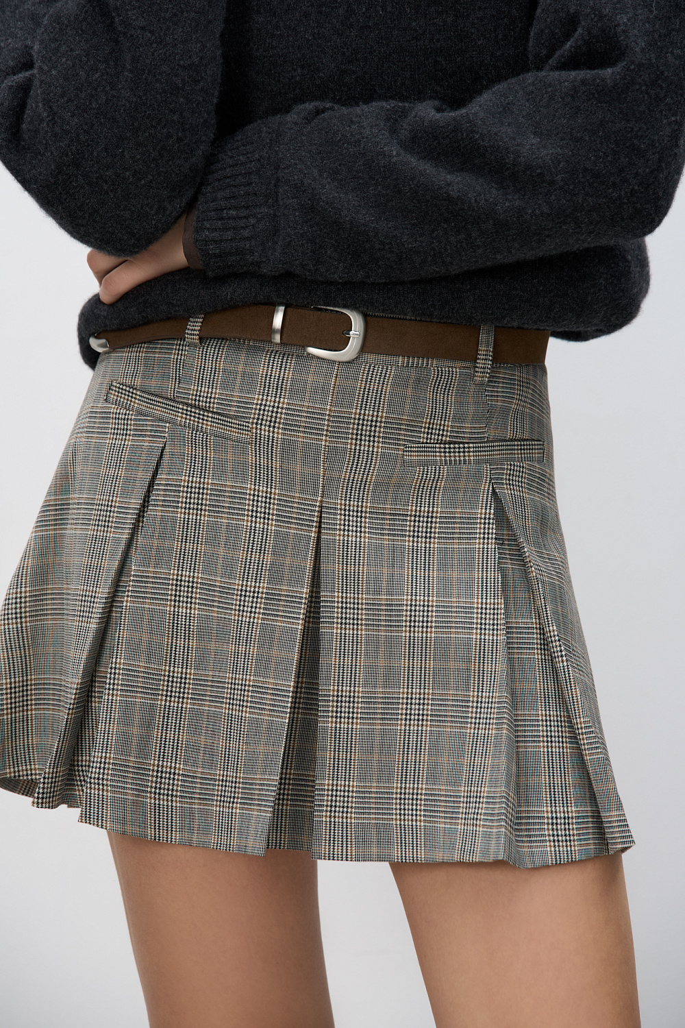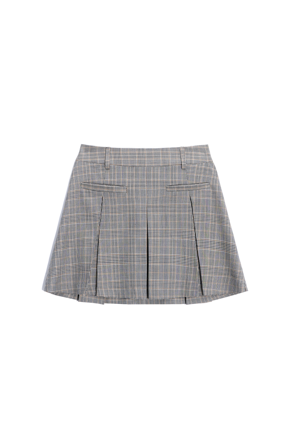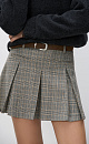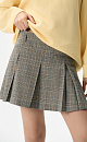 Mini-length skirt in glenchek check made of wool. The model has a straight fit, large pleats, a waistband with belt loops, front slash pockets and a zipper closure. The product is unlined.