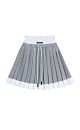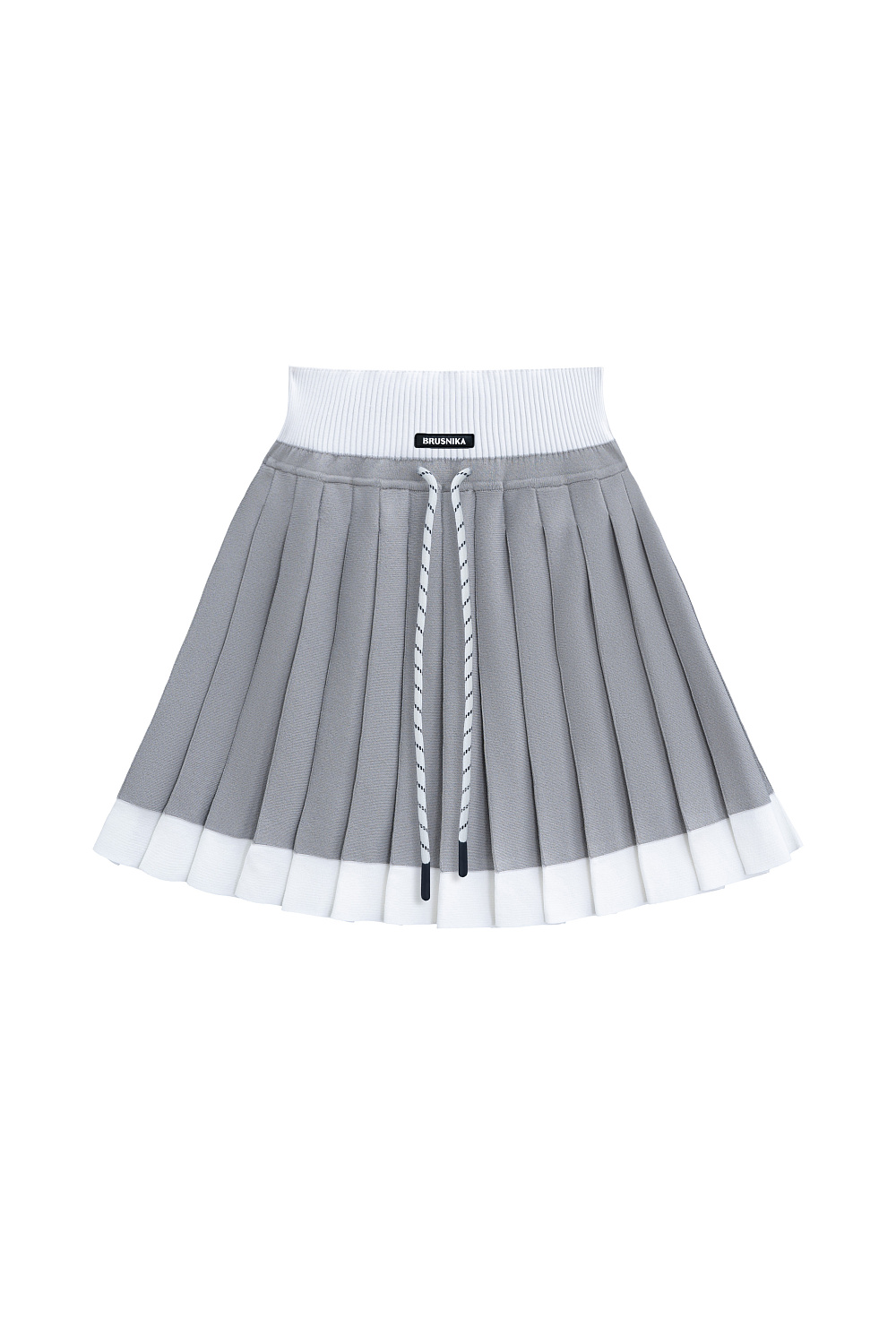 Mini-length pleated knitted skirt made of viscose. Model with a wide ribbed elastic waistband. The belt and lower part of the skirt are made of yarn in a contrasting color.