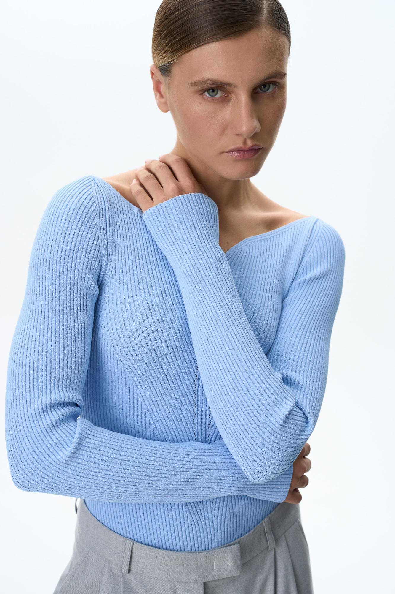 Ribbed viscose knitted bodysuit with long sleeves and a curved neckline.