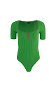 Ribbed knit bodysuit. Features square neckline, short sleeves and hook-and-eye closure.