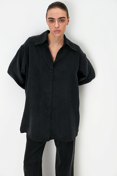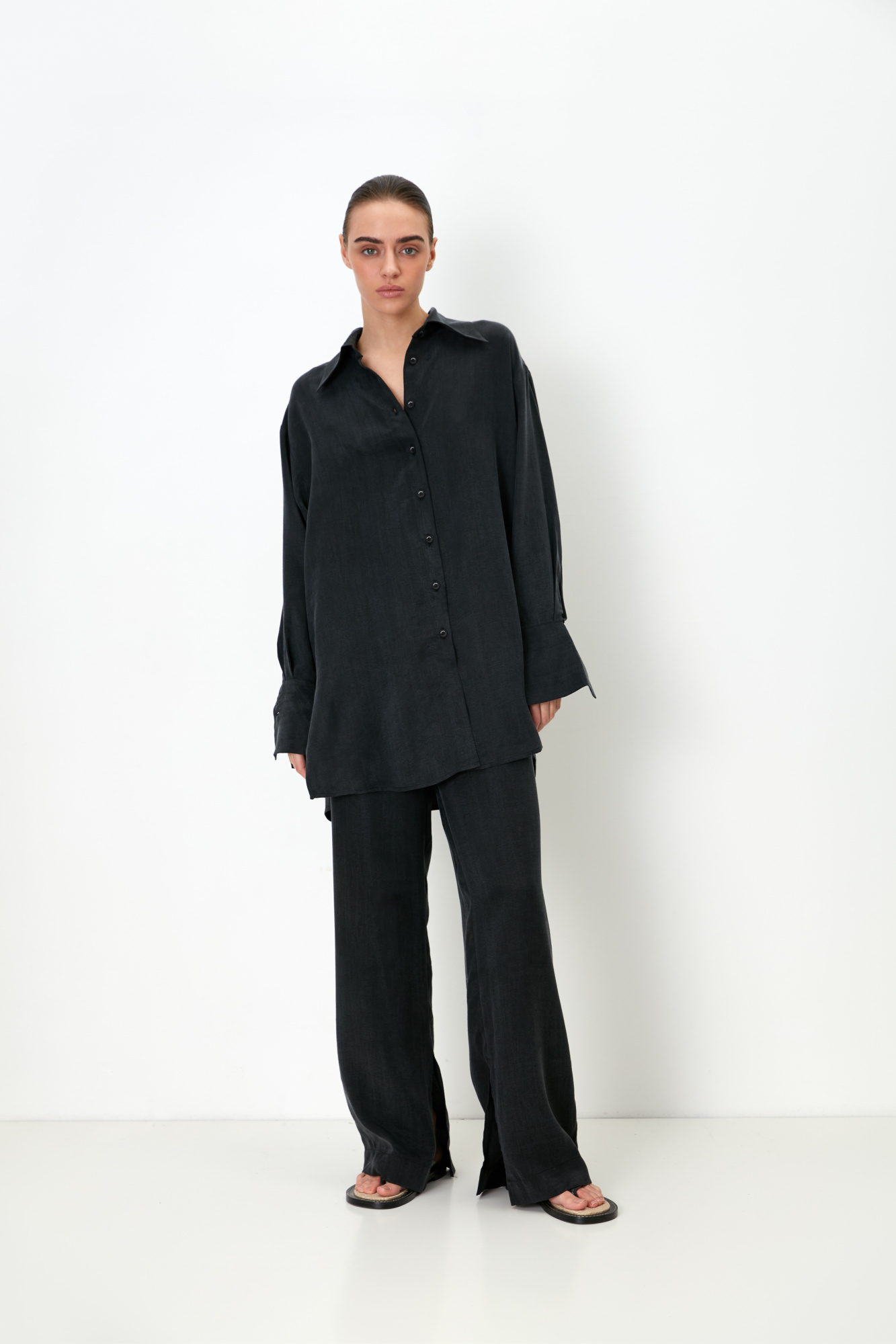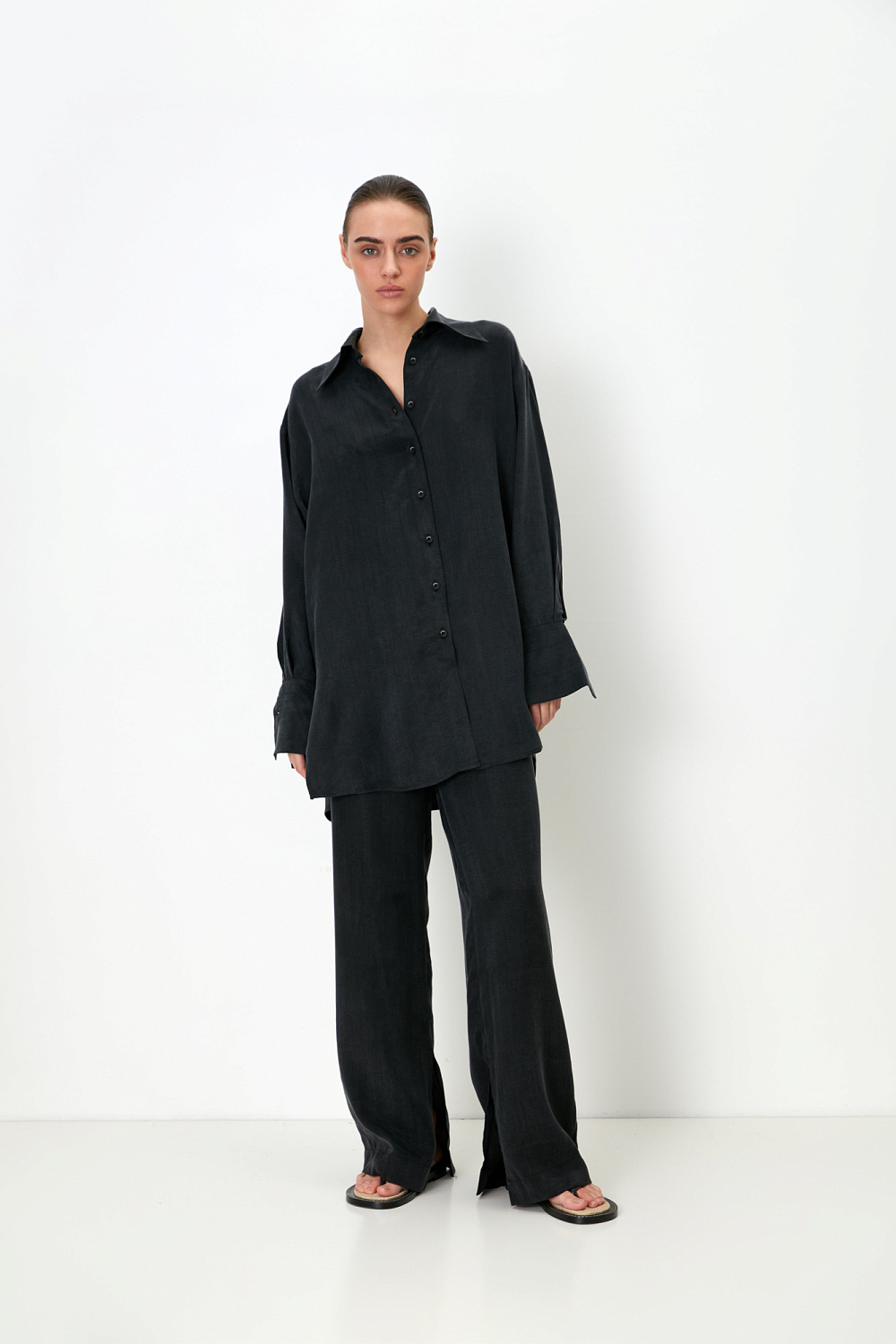 Cupra trousers with slits on the sides. Loose silhouette model with zipper and button closure.