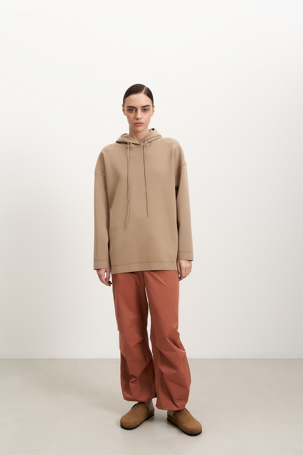 Loose fit parachute trousers. Elastic drawstring with a cord stopper at the waist and slanted pockets.