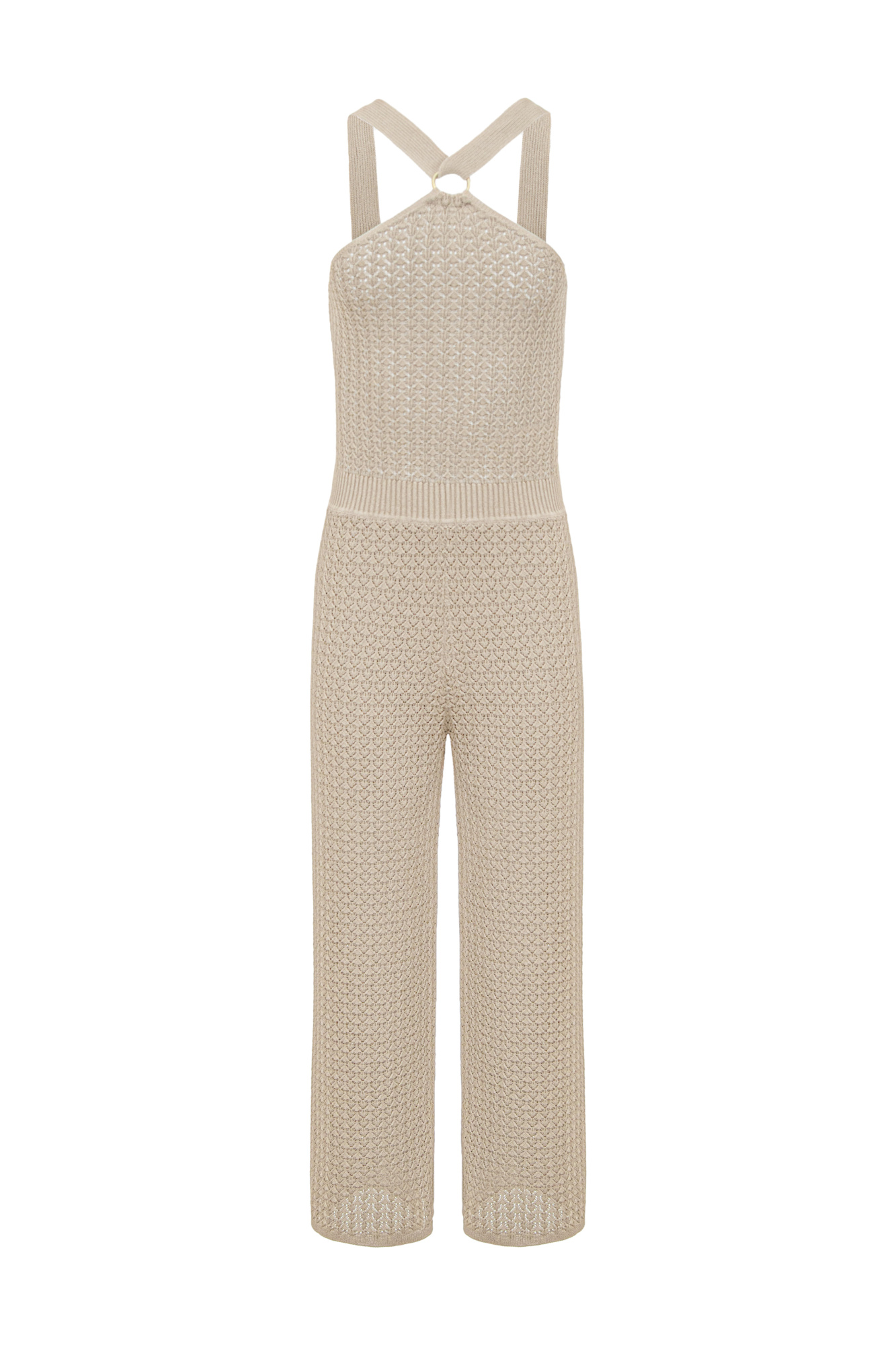 Knit openwork jumpsuit with wide straps and a ring clasp.