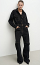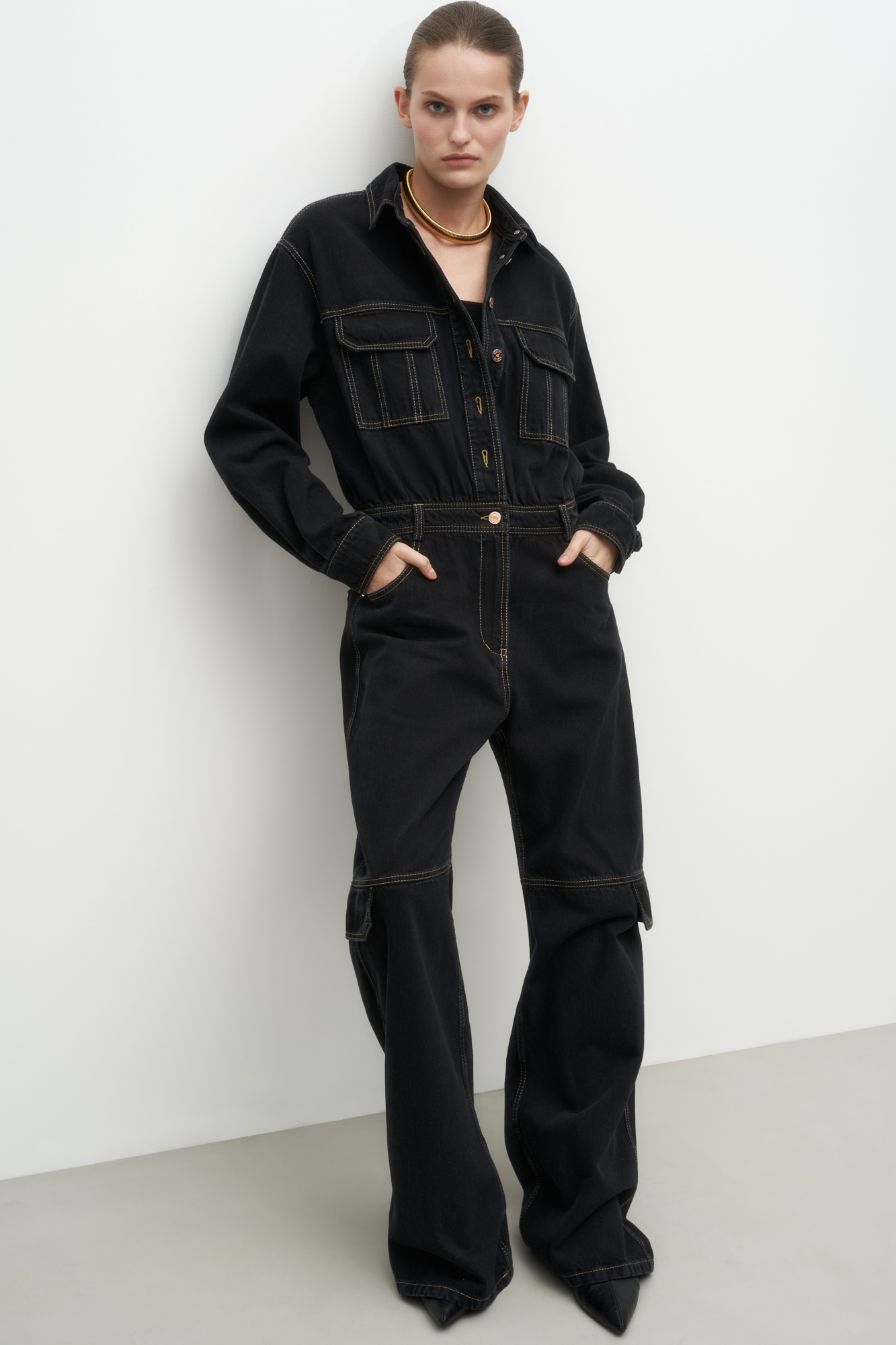 Denim jumpsuit. Long sleeves with cuffs. Turn-down collar. Front patch pockets on the chest, side pockets and back patch pockets. There are straps on the waist for a belt. Concealed zip fastening and metal buttons.