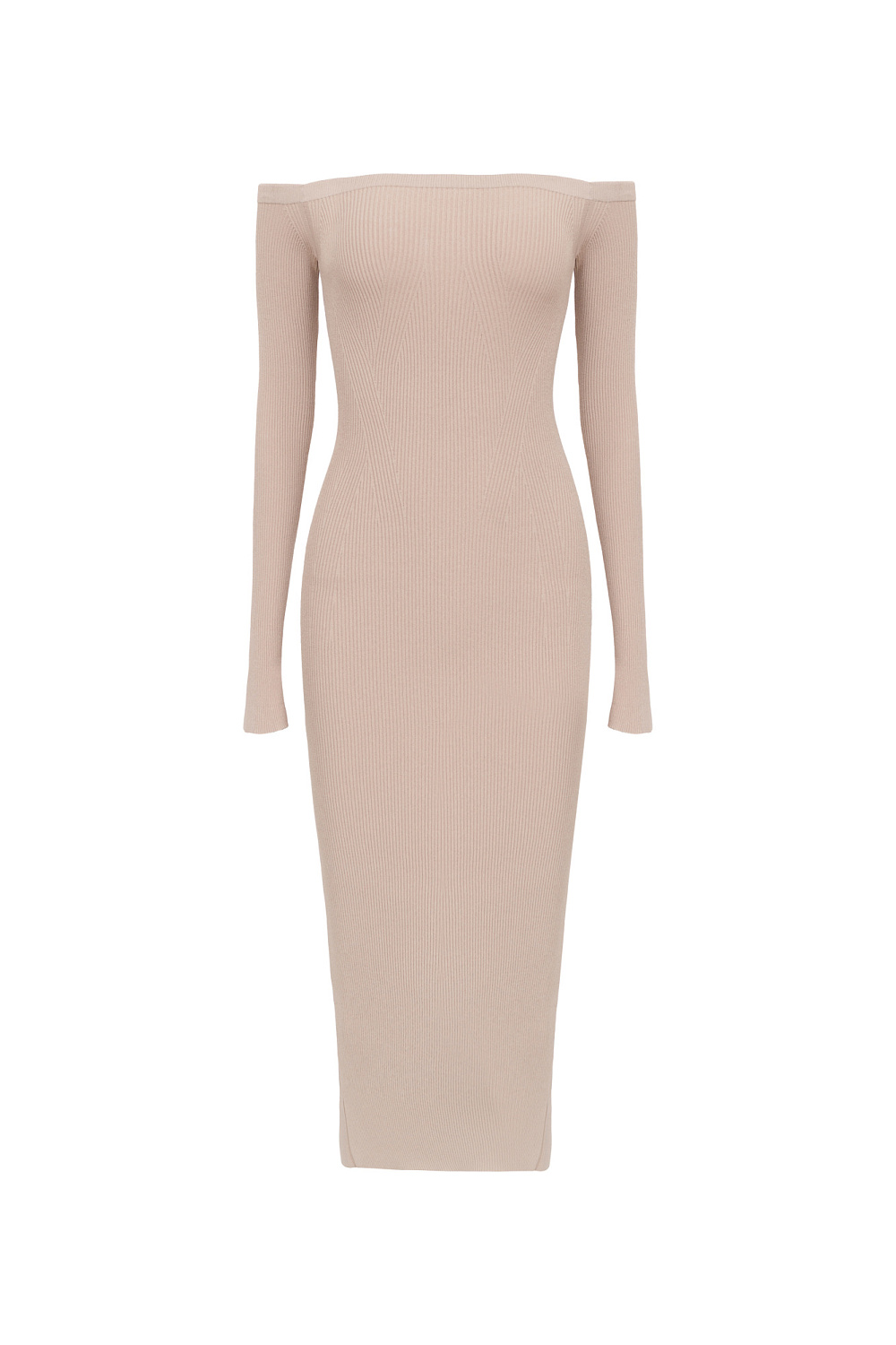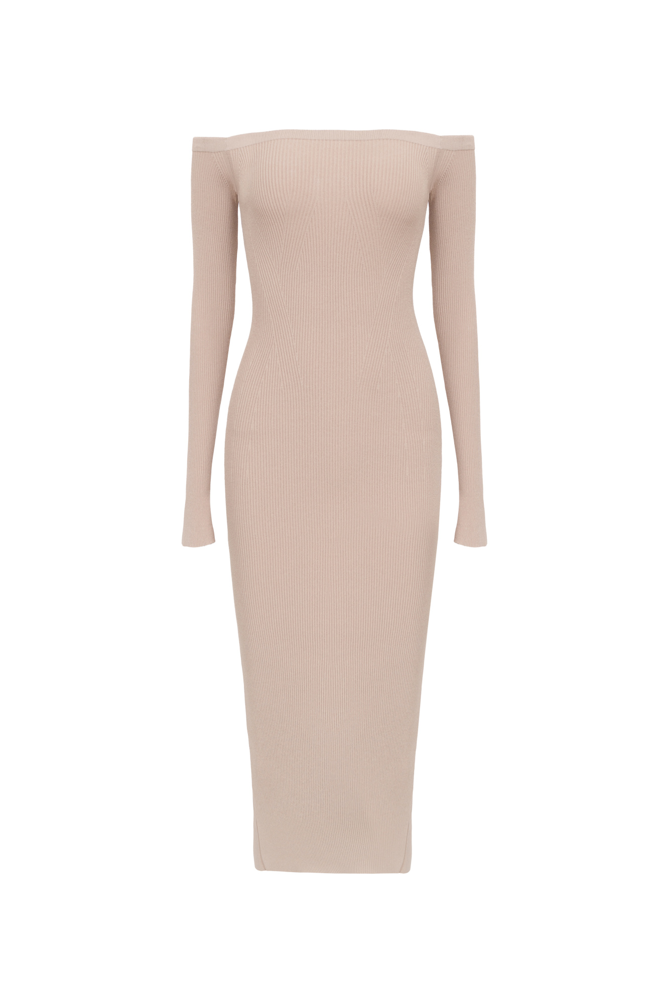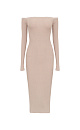 Off-the-shoulder fitted dress with a vent at the back and long sleeves.