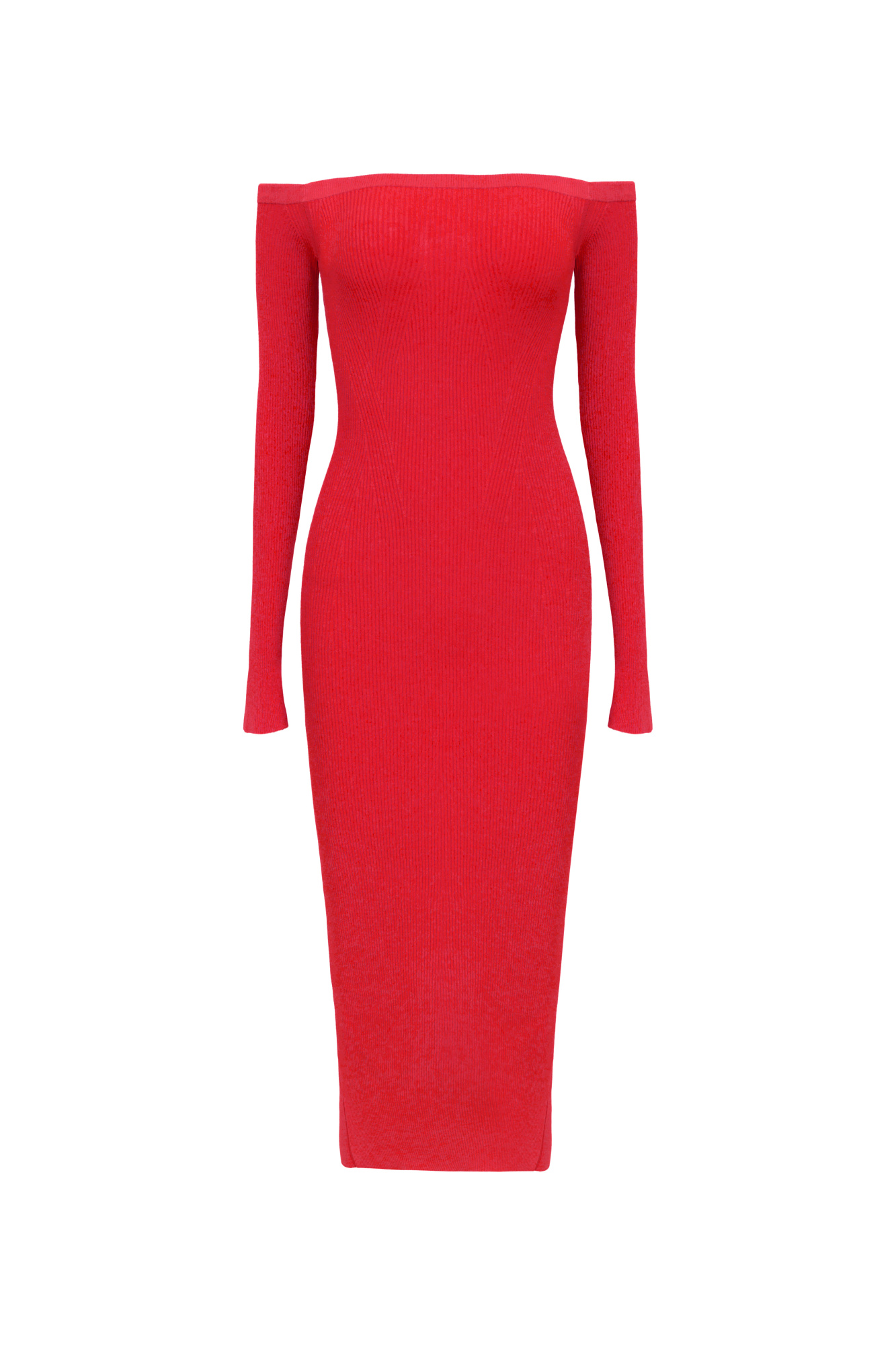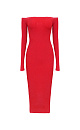 Off-the-shoulder fitted dress with a vent at the back and long sleeves.