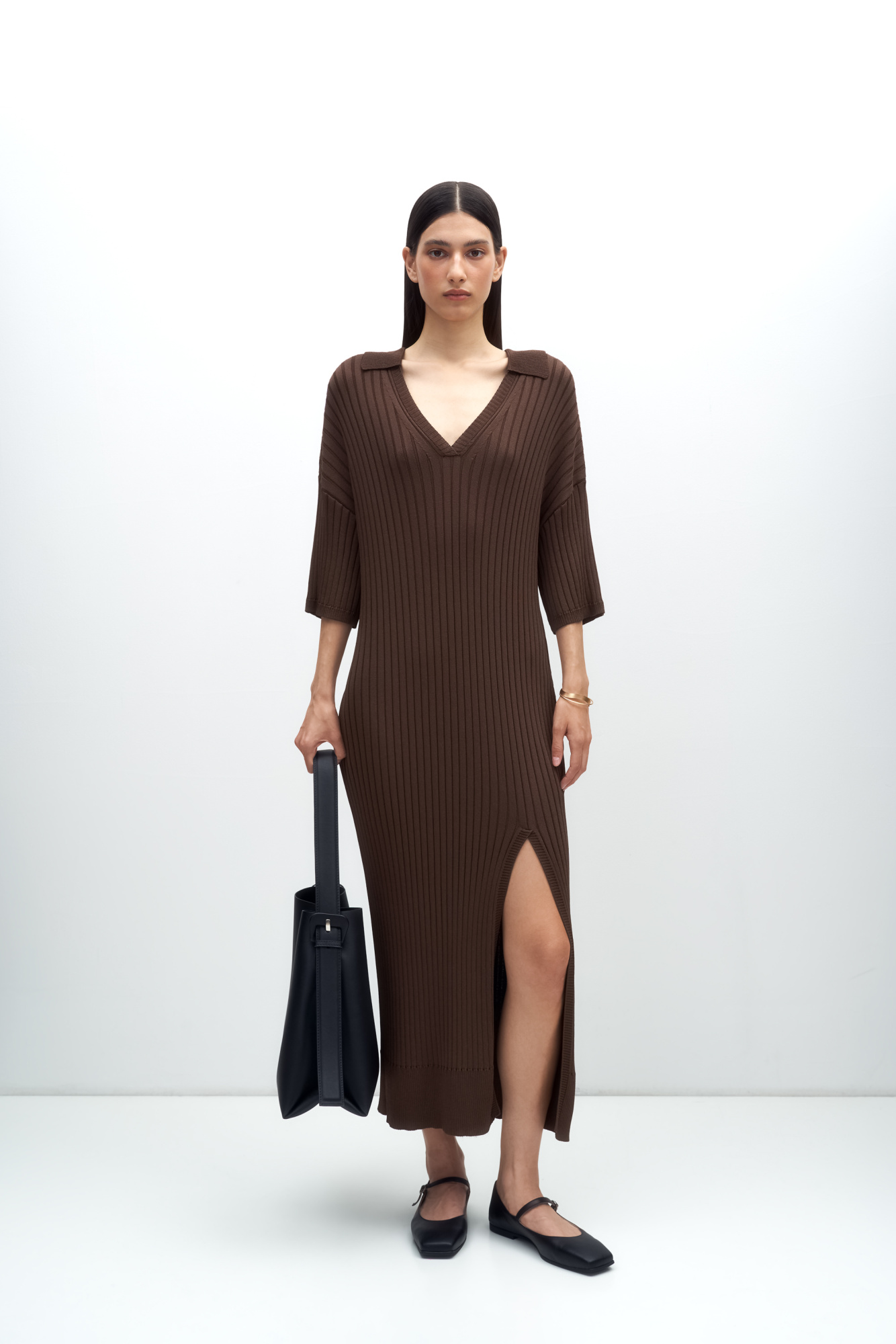 Elegant ribbed knit dress with polo collar and front slit. 3/4 length sleeves.