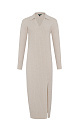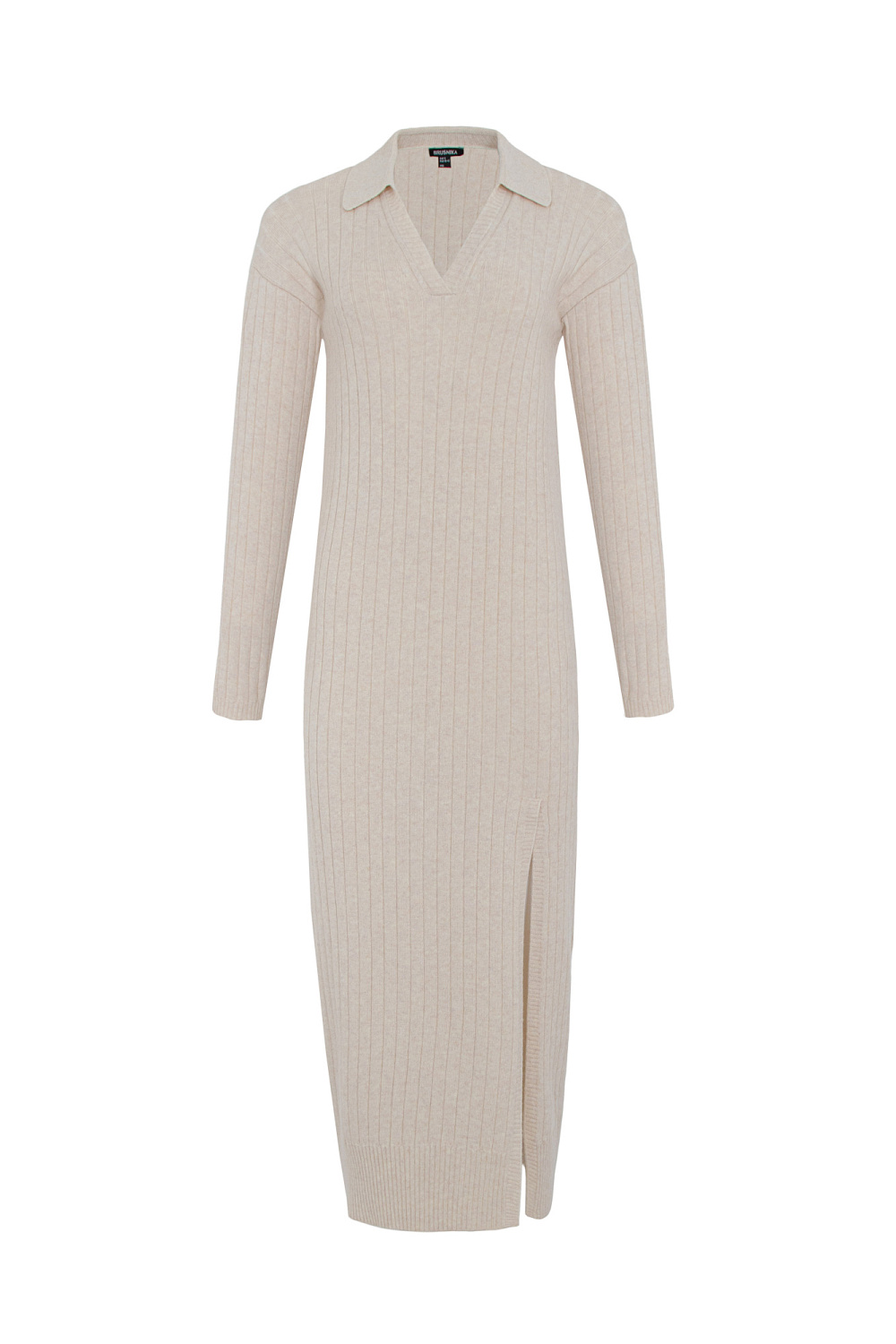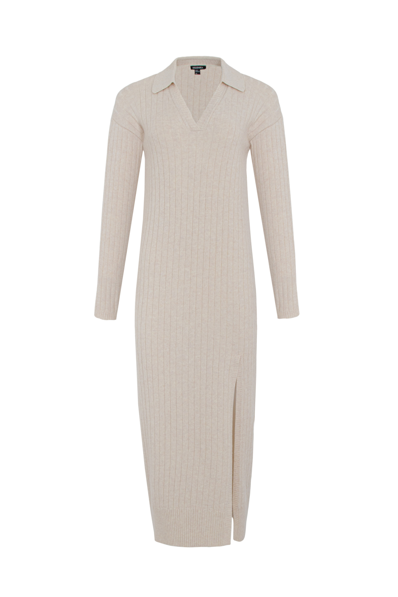 Knitted wool blend dress with V-neck. Model of a free silhouette of midi length. Long sleeves and leg slit.