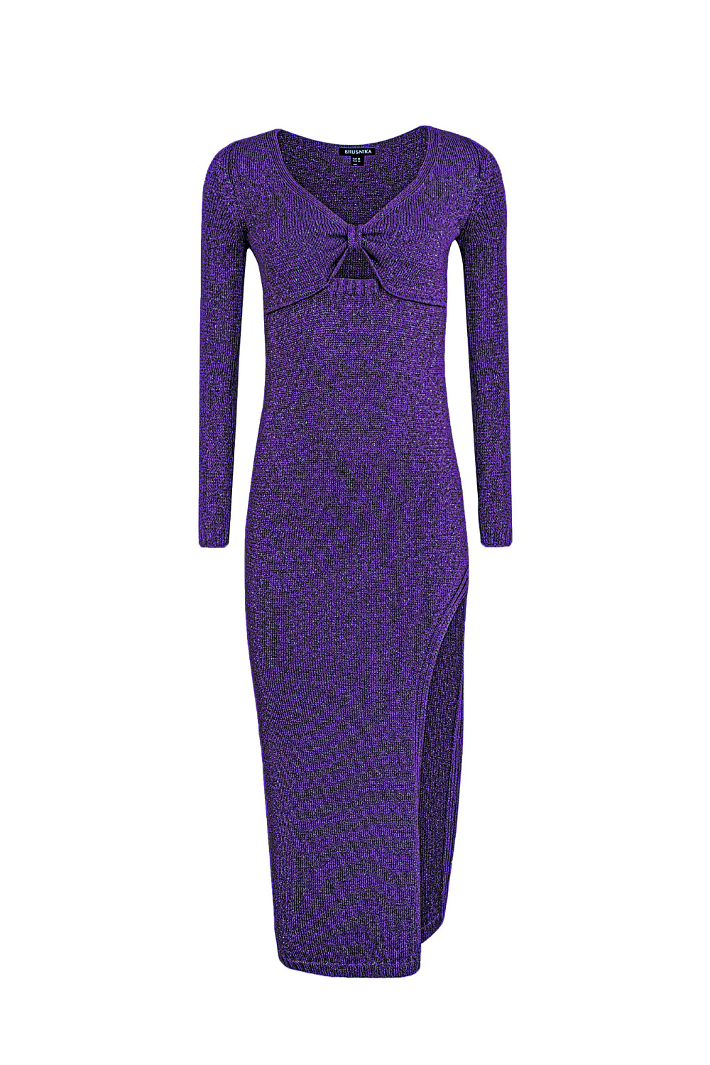 Viscose bodycon midi dress with lurex. Features side slit and deep V-neck.